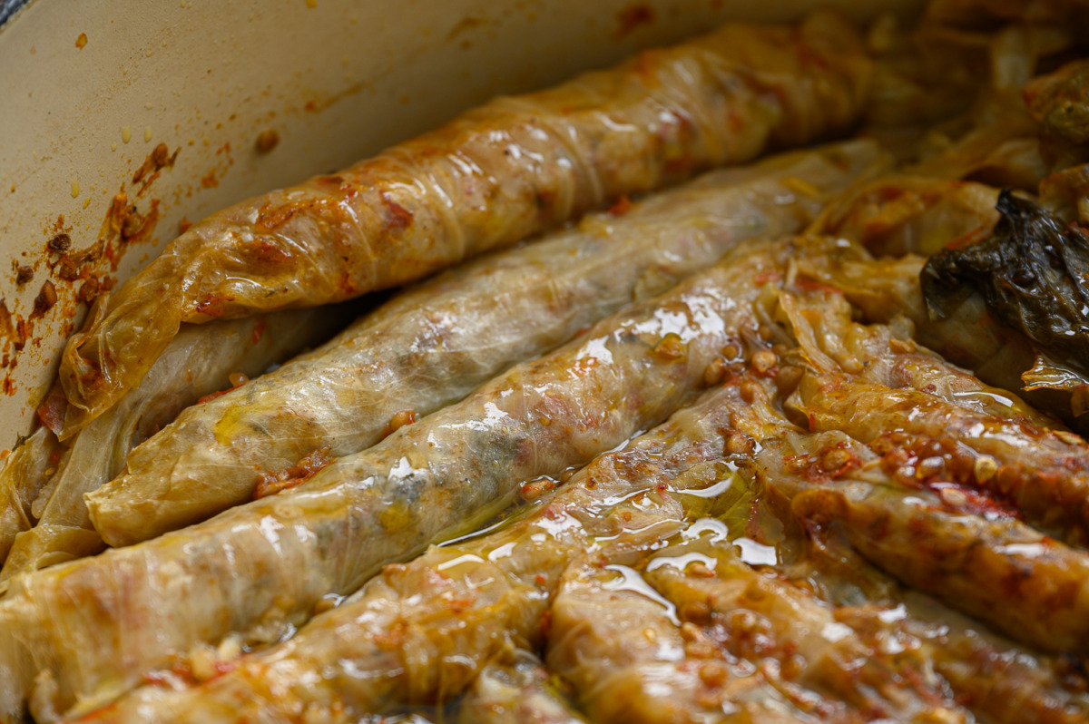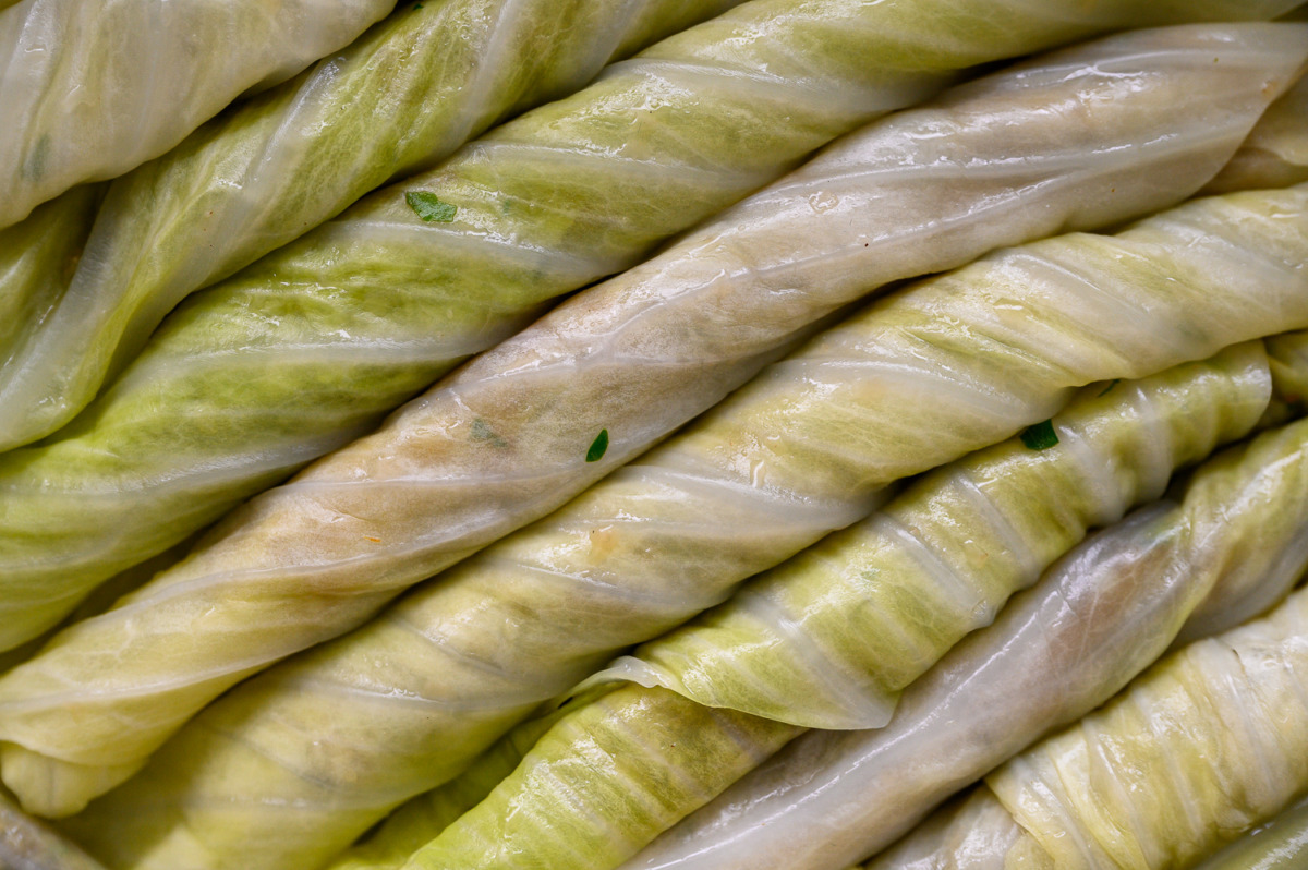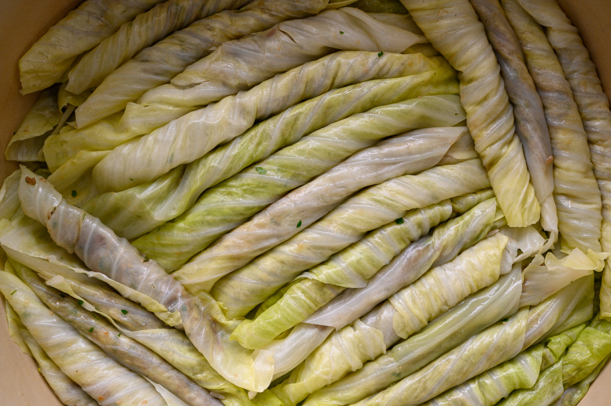 הכרוב: נמלא סיר רחב במעט מים (כ-2 כוסות), נכניס את הכרוב, נכסה את הסיר ונאדה את הכרוב כ-15 דקות על אש גבוהה. נסנן מהמים ונצנן. נוציא את הליבה בעזרת סכין ונפריד לעלים. לכל עלה נוציא את העורק הקשה ונחתוך לשניים או ארבעה “בדי גלגול” (תלוי בגודל העלה-עלים גדולים 4)