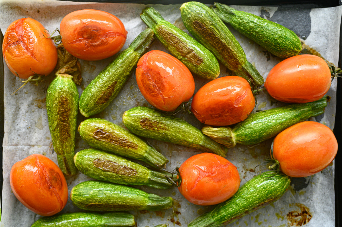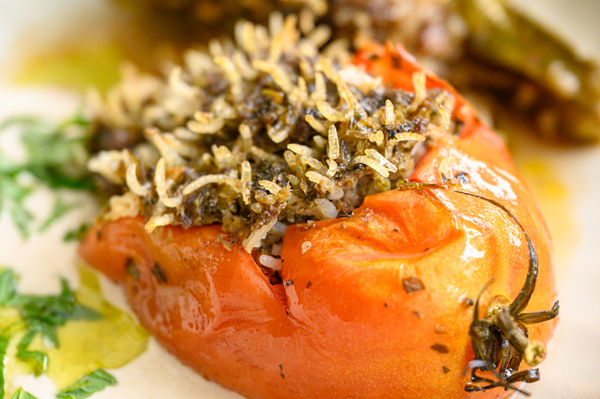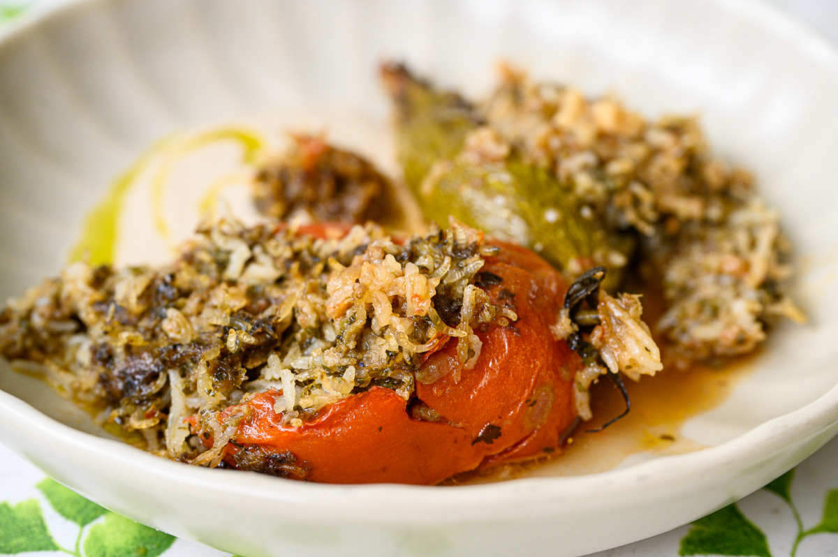 התיישבתי ורק הבטתי ביופי הזה שנרגע על השולחן. ואז חשבתי ככה בראש הקטן קטן שלי שעמוס בככ הרבה ג’אנק חרדות ונונסנס מה יקרה אם אני אכניס את הירקות לתנור ואז אמלא. כמו שעשיתי לקישואים, אבל הפעם גם עגבניות