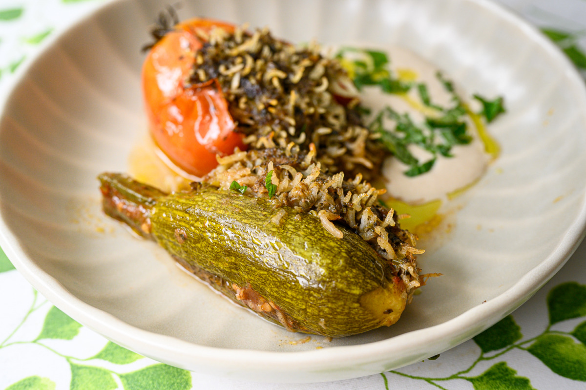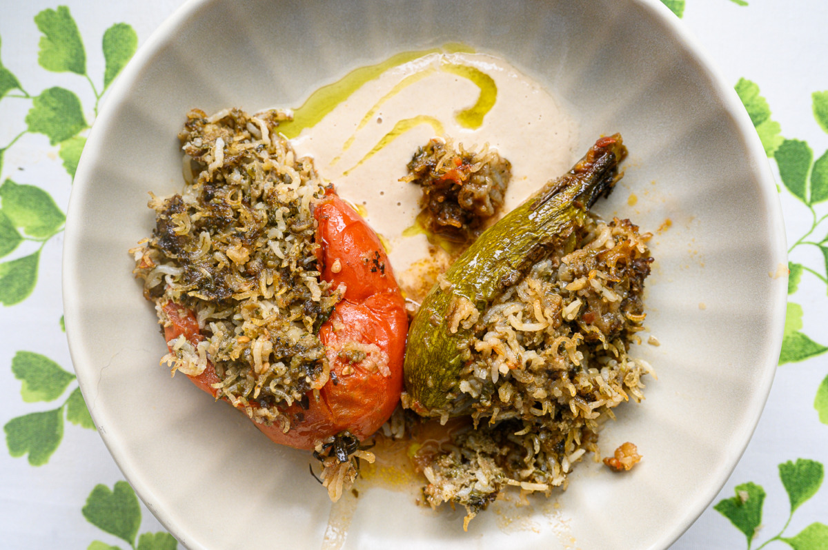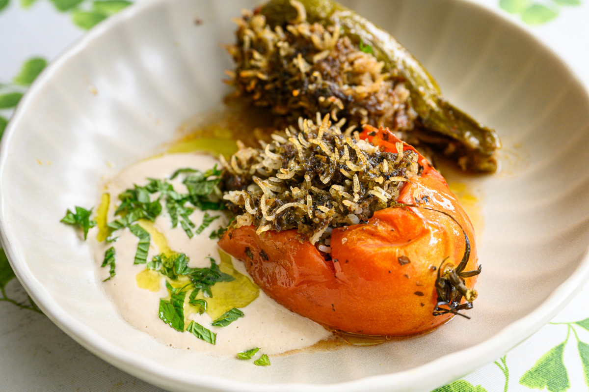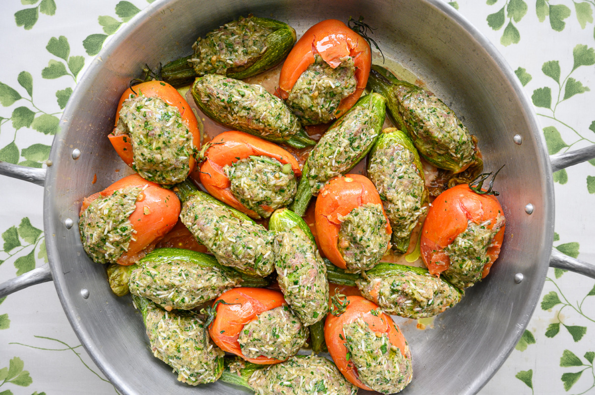 התיישבתי ורק הבטתי ביופי הזה שנרגע על השולחן. ואז חשבתי ככה בראש הקטן קטן שלי שעמוס בככ הרבה ג’אנק חרדות ונונסנס מה יקרה אם אני אכניס את הירקות לתנור ואז אמלא. כמו שעשיתי לקישואים, אבל הפעם גם עגבניות
