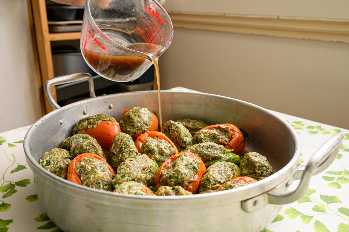 המילוי: טוחנת את העשבים עם שום, סלרי פלפל חריף ובצל מערבבת בקערה עם אורז, בשר טחון, פירורי לחם תבלינים ומעט שמנזית