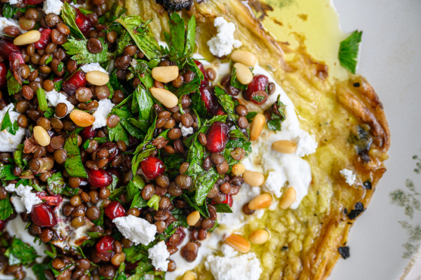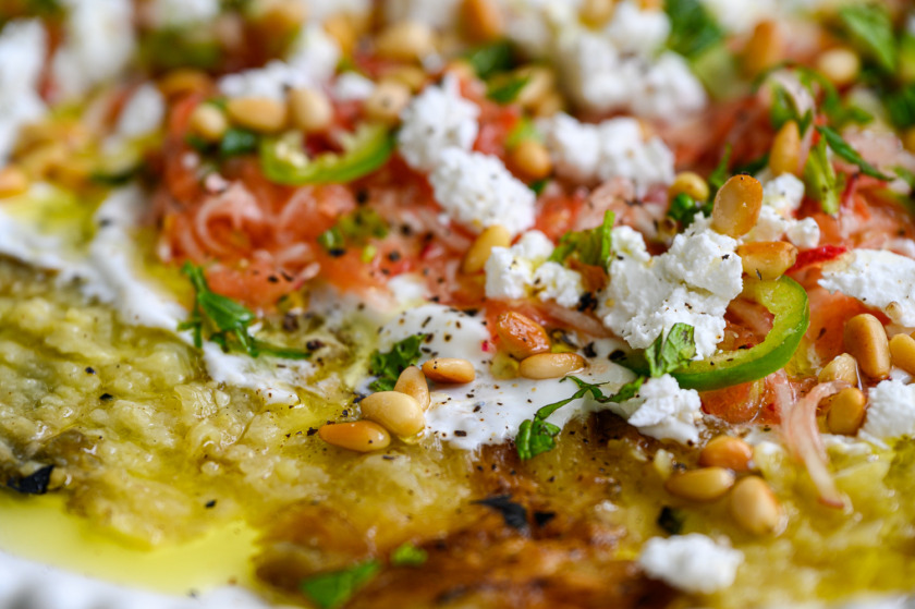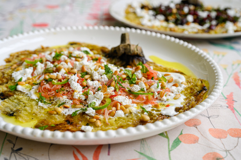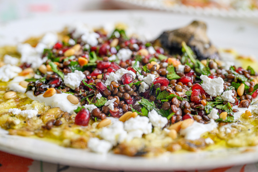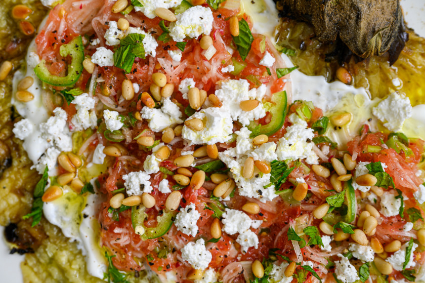 5. הרכבה: על שמלת החציל נמרח בעדינות שכבה של יוגורט, מעליה הסלט. נעטר בפירורי פטה וצנובר קלוי