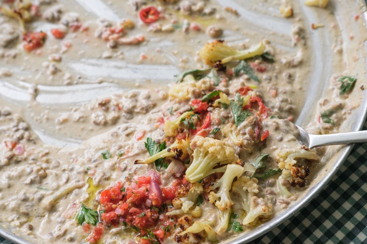8. נגיש – ניצוק את המסבחה לכלי הגשה שטוח רחב ויפה, ננקד אותה בסלט עגבניות, בחצי כוס מהעדשים שהנחנו בצד, במעט עלי פטרוזיליה וממעל כתר יפהפה של פרחי כרובית ברוטב שום לימוני.
