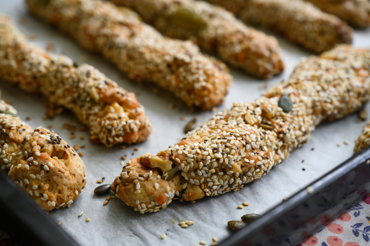 4. נשמן את המלבן והידיים שלנו בשמן זית, ניקח כל רצועה ובידיים משומנות נהפוך לנחש, נצפה בזרעונים ונניח על דף אפייה בתבנית תנור. כך נעשה לכולם.