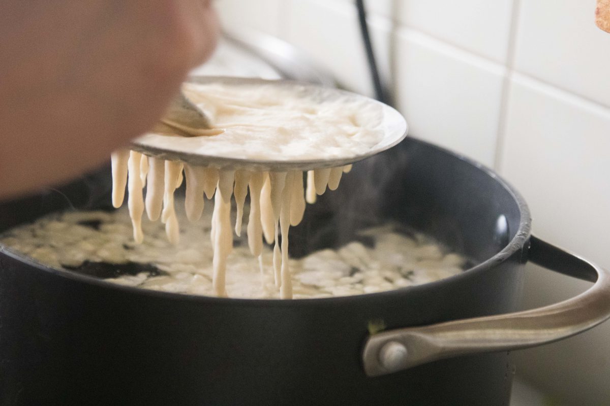 3. דרך כף גדולה עם חורירים, נעביר את נטיפי הבצקניות שיקפצו ראש לסיר המים הרותחים, כשצפים, נעביר לקערה נקיה עם כף שמן צמחי. ככה נכין מכל העיסה בצקניות.