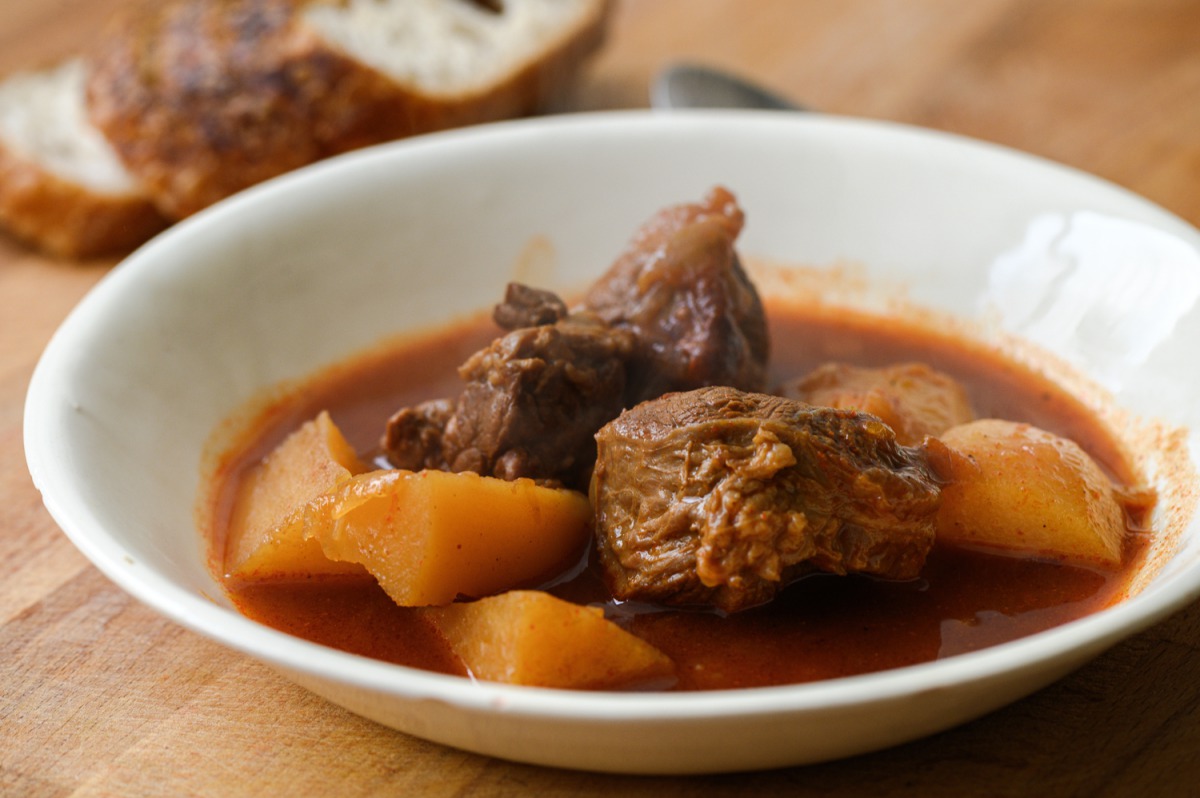 ברבע כוס שמן נטגן הבצל על להבה גבוהה עד הזהבה, נוסיף קוביות הבשר עד שישנו צבעם לאטום (כ-7-9 דק’), נוסיף פפריקה, רסק עגבניות ומלח, נערבב. נוסיף ליטר מים נערבב טוב טוב.