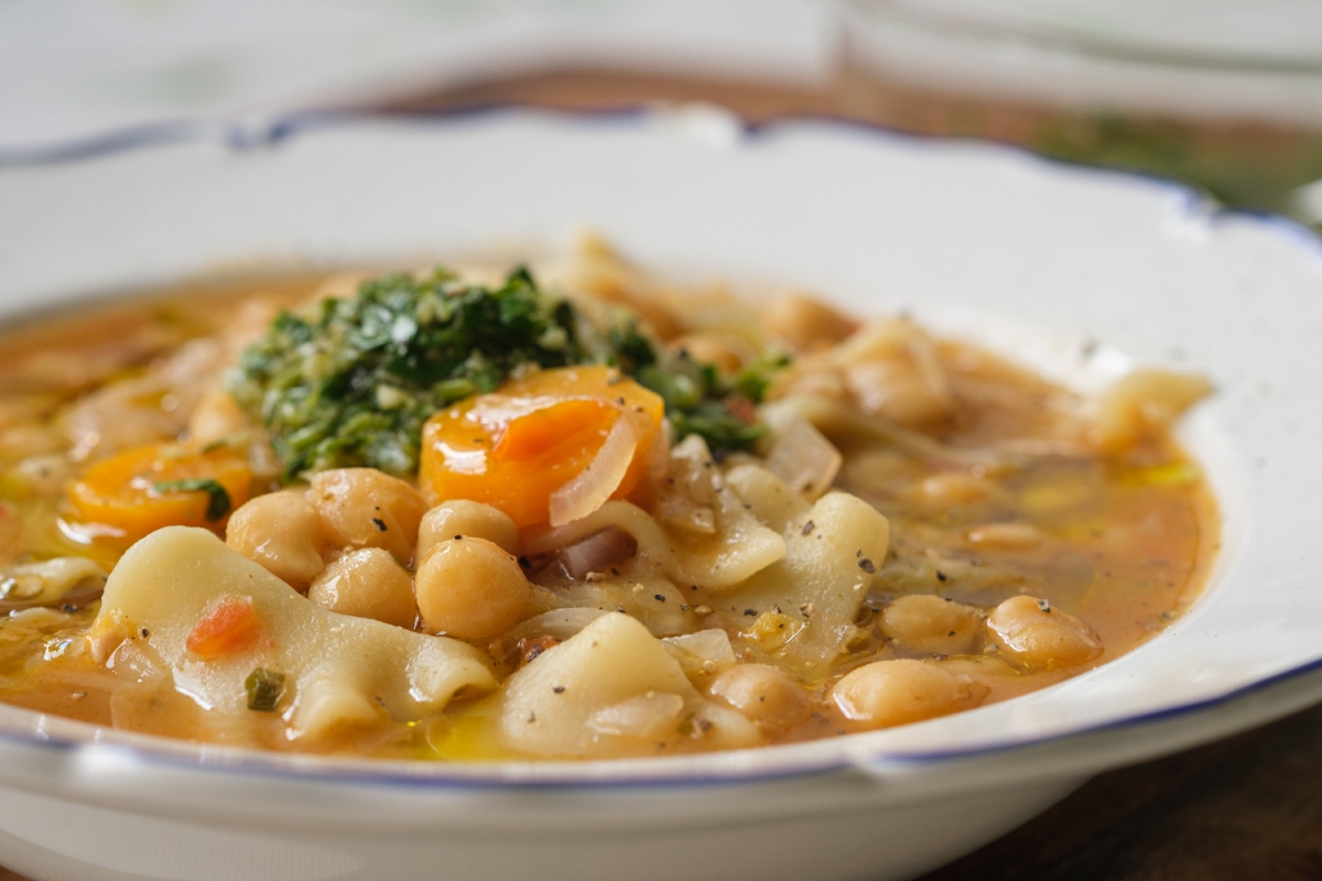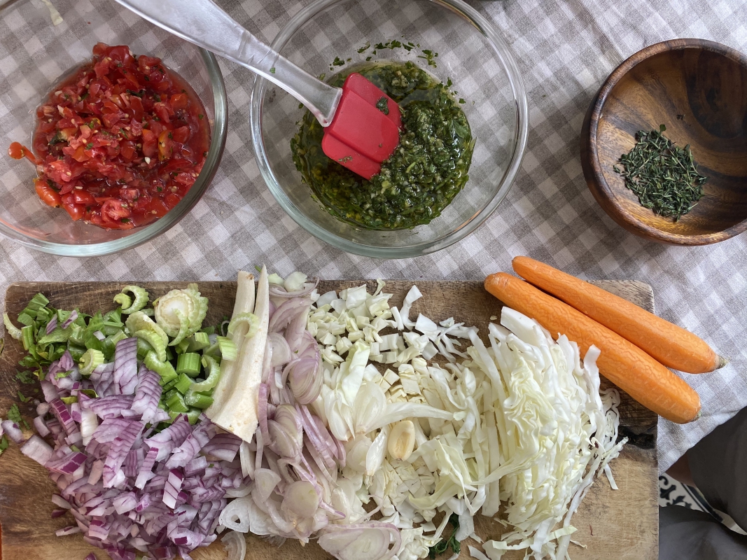 6. נגיש עם פסטו פטרוזיליה ליד (חובה!). לכל צלחת מרק, כפית.  (עוד אפשרות  לערבב את כל  הפסטו בסוף בישול המרק).