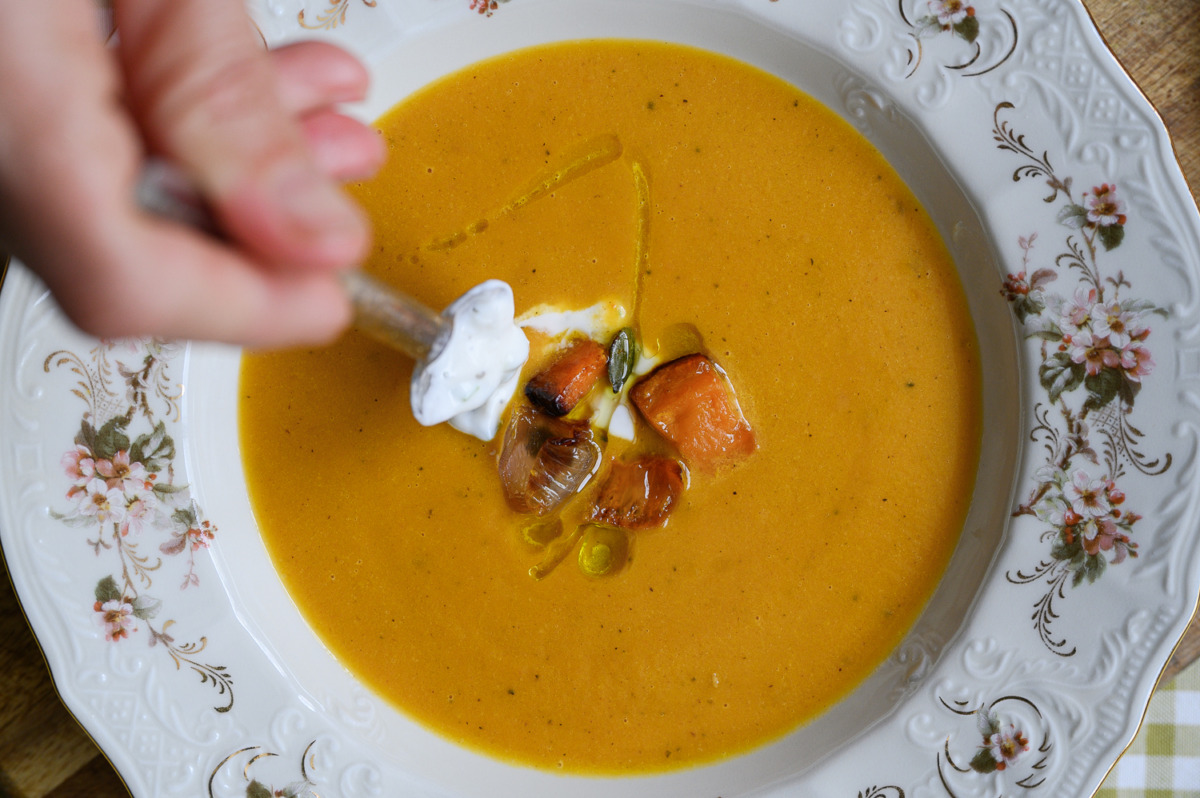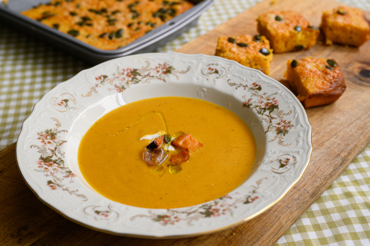 וליד זה מרק עדין וקטיפתי עם טעמים עמוקים של ירקות כתומים צלויים. שלא זקוק לשום תיבול חוץ ממלח ומעט אגוז מוסקט. – יחד הם ארוחה מקסימה