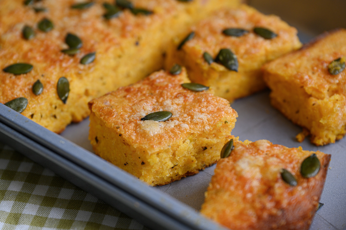 נעביר לתבנית משומנת היטב, ניצוק ונשטח, נעטר בפרמזן וגרעיני דלעת ונשקב בעוד 2 כפות שמן זית.