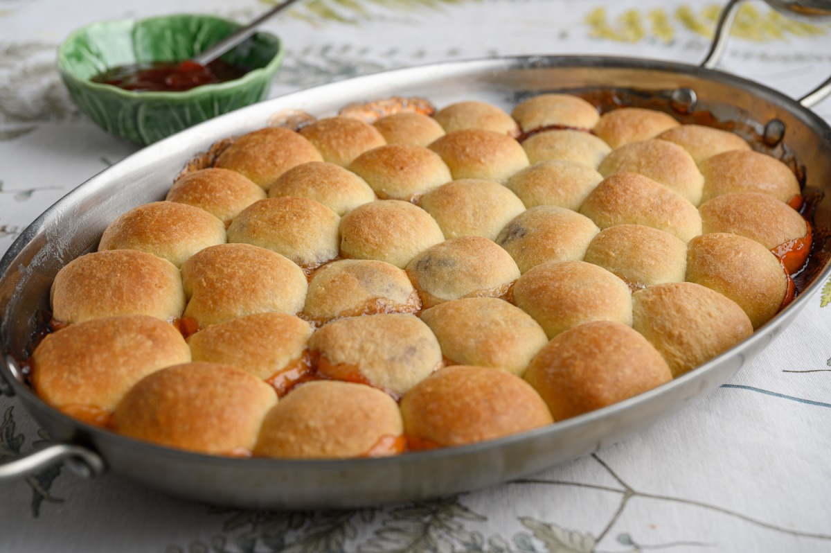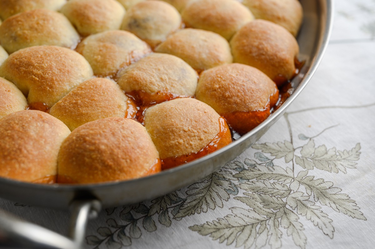 4. באמצע כל עיגול נניח חצי כפית ריבה (הריבה צמיגית אחרי לילה במקפיא וקל לעבוד איתה) נסגור את הכדור היטב, נגלגל אותו עם הידיים ונניח בתבנית משומנת בחמאה