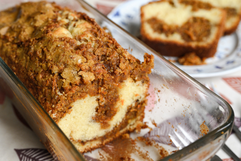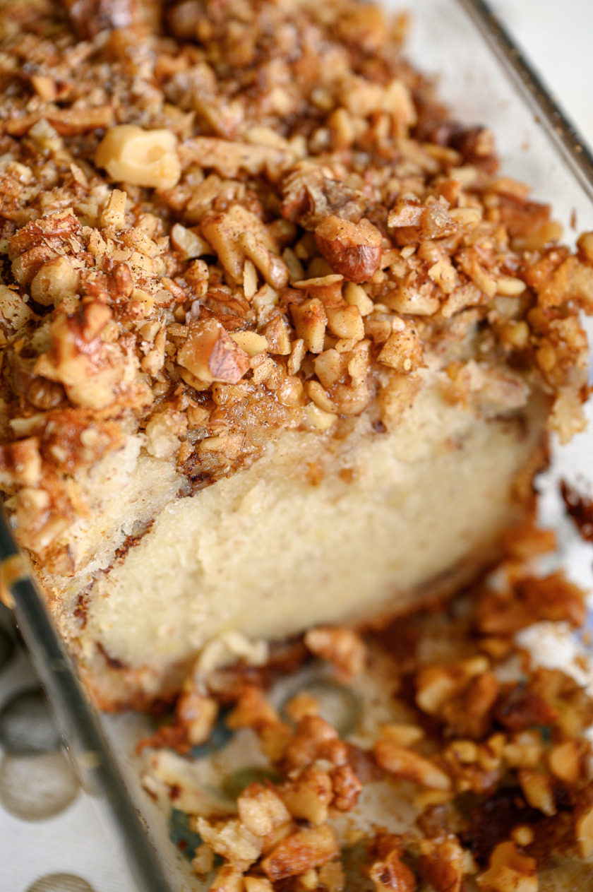 4. נרכיב עוגה: חצי מהבלילה ניצוק על בסיס התבנית,נפזר באופן אחיד את אבקת הקינמון המתוקה ושוב שכבת בלילה הנותרת ומעליה הפירורים המפתים.