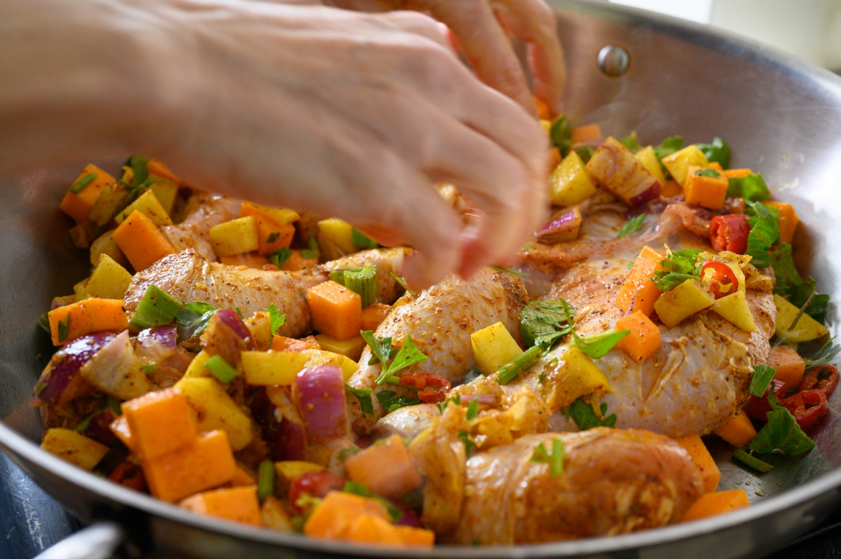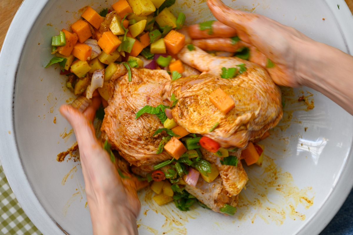 1. בקערה גדולה נערבב עוף עם 3 כפות שמן זית, כפית מלח, כפית כורכום, כפית פפריקה, כפית בהרט וכף לימון כבוש, נצפה טוב, נוסיף למחול הקערה את קוביות התפחי אדמה, דלעת, בצל, וסלרי וגם אותם נצפה ברוטב.