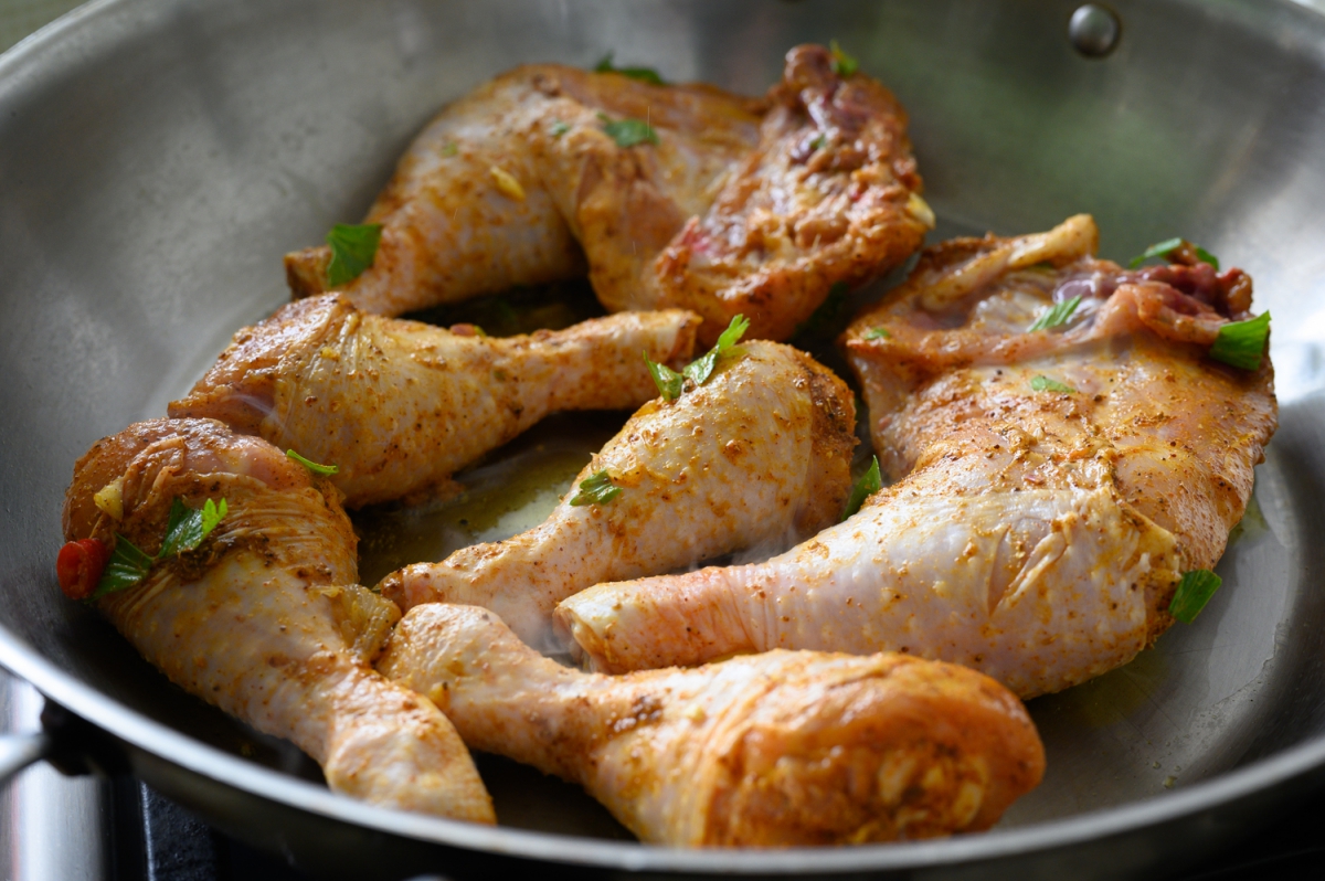 2. על כיריים אש גבוהה נלהיט סיר רחב ושטוח, נוסיף לסיר 3 כפות שמן זית ונכניס את כרעי העוף והפולקע נצרוב אותם היטב (כל צד כ-6 דקות מלאות, לא לנתק עוף בכח ברגע שמשחים, הוא ניתק לבד), אחרי כ-6 דקות כשהופכים צד, נוסיף את קוביות הירקות בינות העוף עוד 5 דקות מלאות.