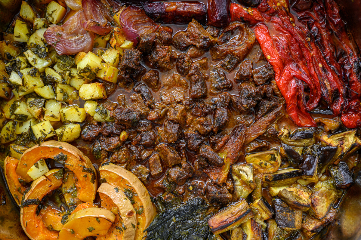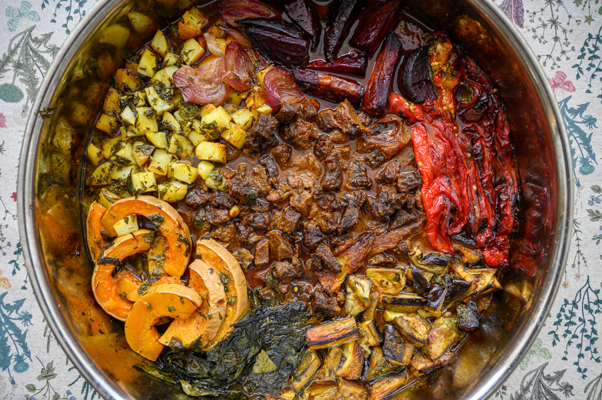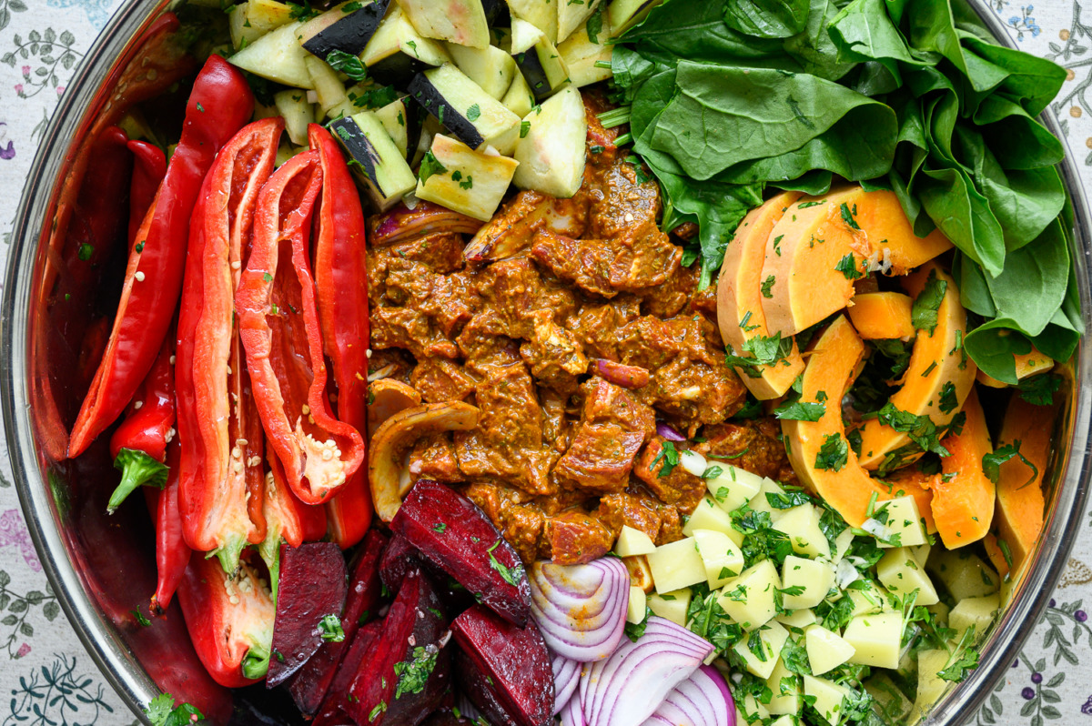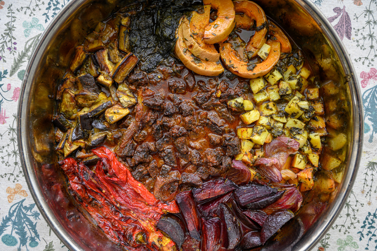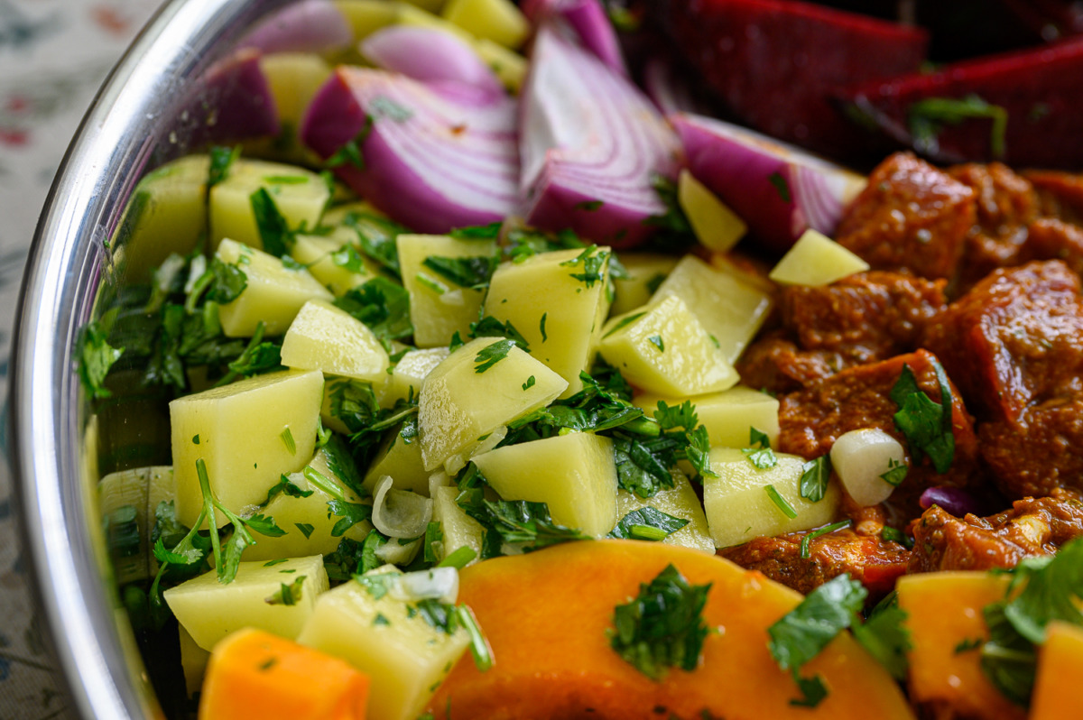 למרינדת תפחי אדמה, דלעת ערמונים, חציל ופלפלים