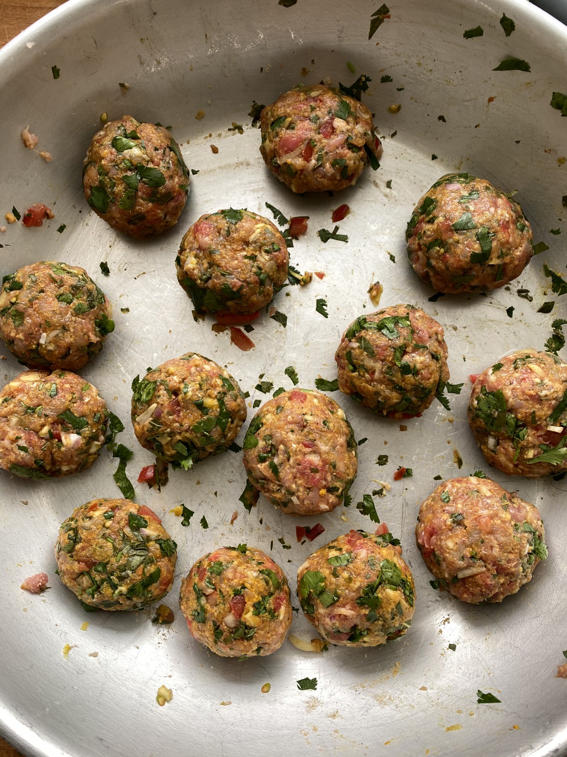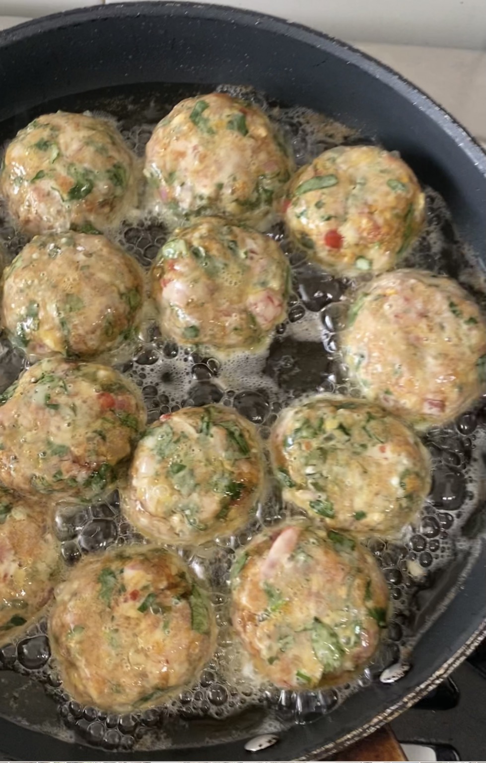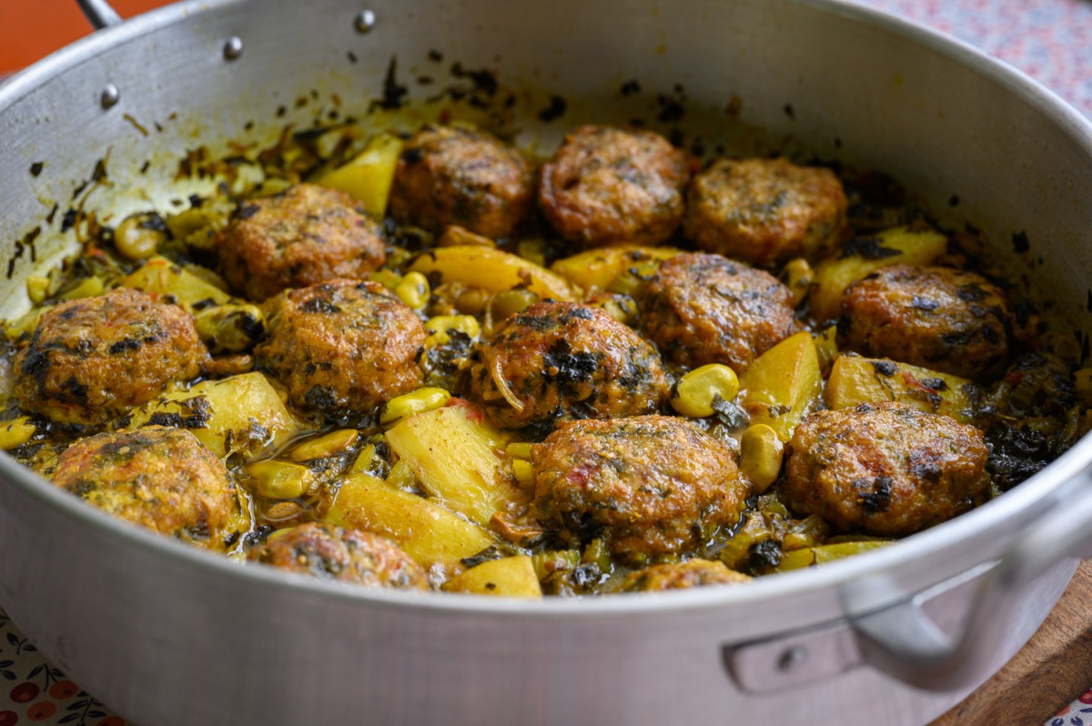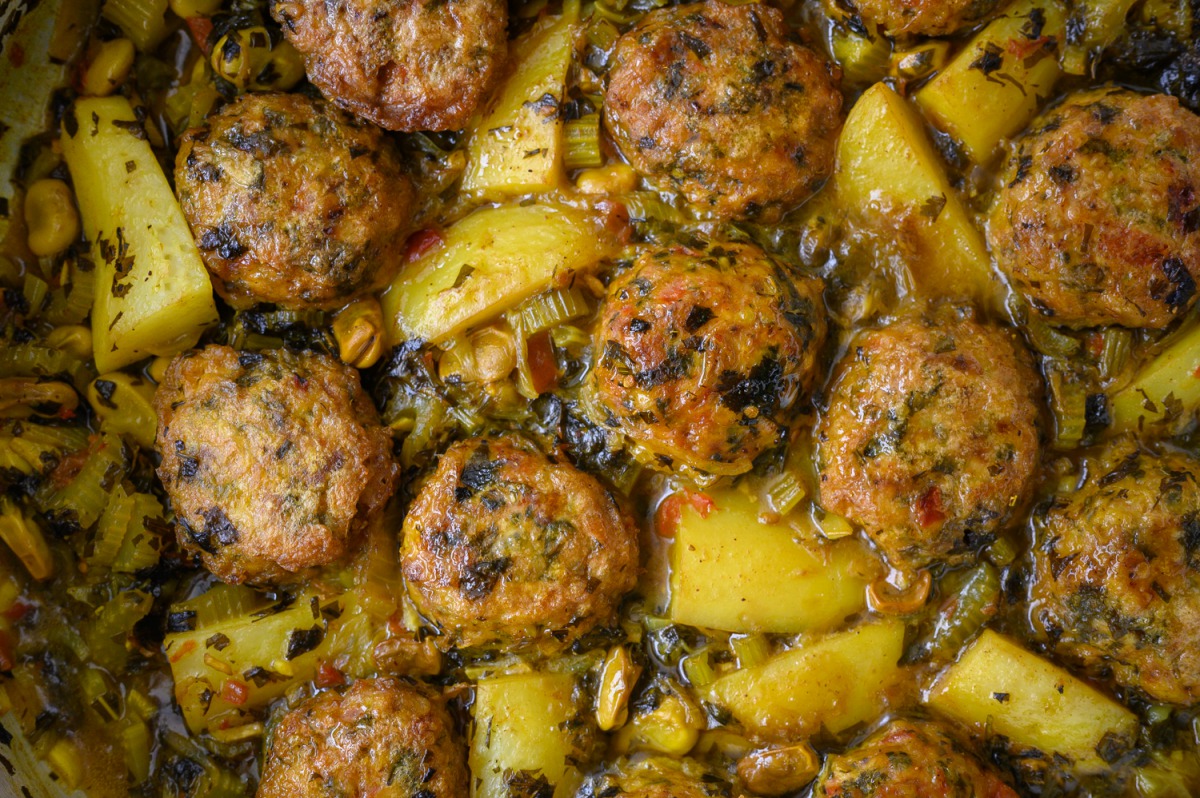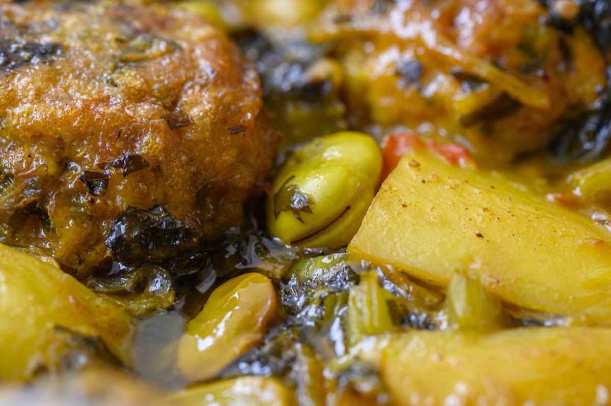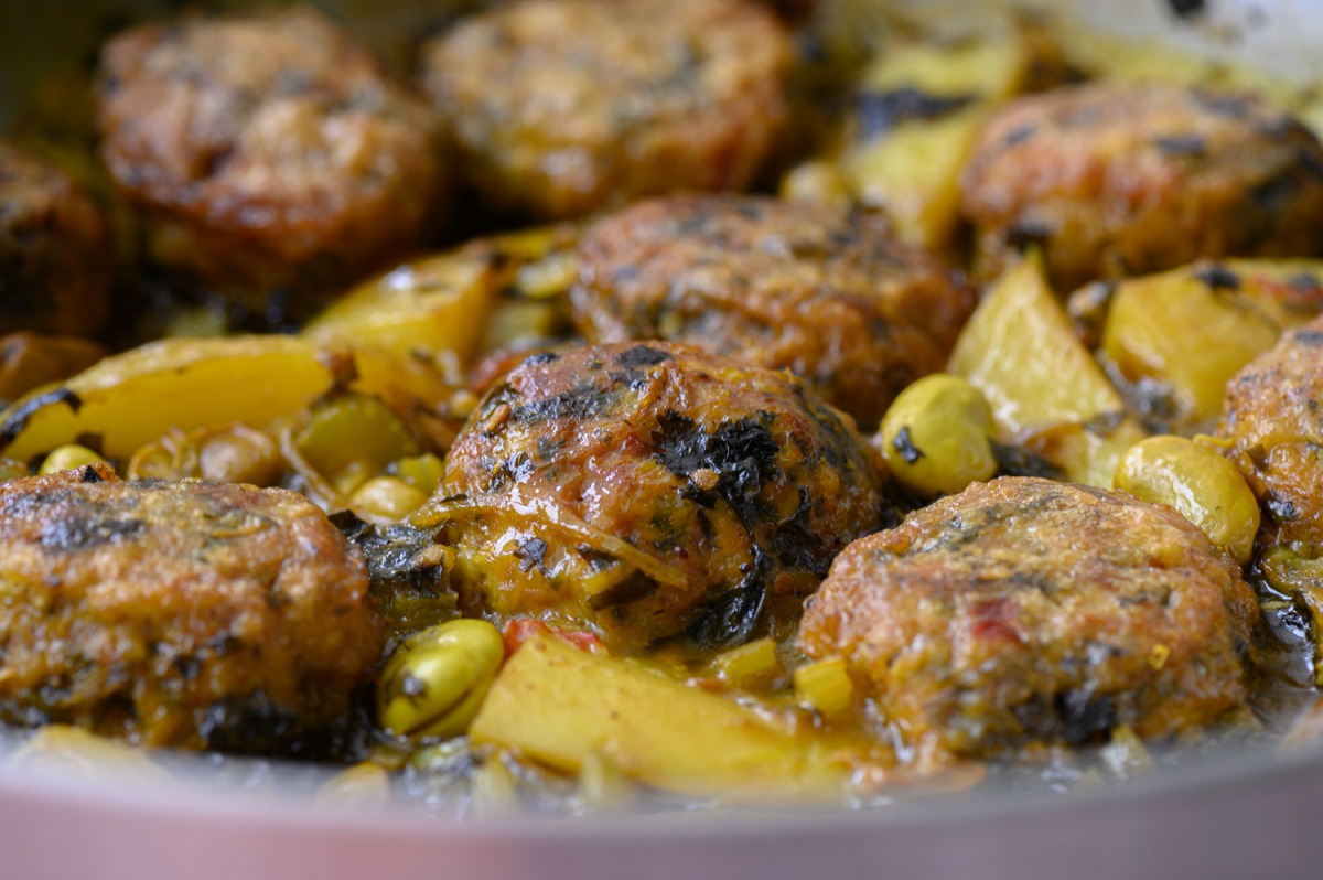 2. הקציצות – נקצוץ 5 עלי גפן דק דק, נכניס לקערה: את הבשר הטחון, חמשת עלי הגפן הקצוצים, כוסברה קצוצה, שן שום כתושה, בצל קצוץ קטנטן, עגבניה קוביות קטנטנות, חצי כוס פירורי לחם או מצה, ביצה ותבלינים: מלח, בהרט, כורכום, פפריקה, פלפל שחור נלוש את העיסה טוב טוב וניצור כדורים בגודל כדור פינג פונג. וכמנהג המרוקאים, נצפה קודם כל את הקציצות בקורנפלור, ניצוק שמן למחבת רחבה וכשהשמן חם נטבול קציצה קציצה בבלילת הביצים ונניח במחבת כ-3 דקות מלאות כל צד.