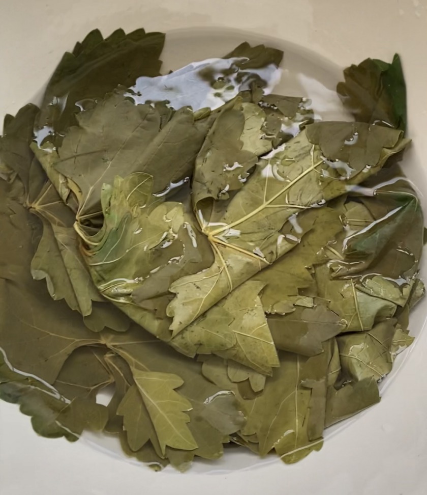 1. נחלוט בקערה עם מים רותחים את עלי הגפן עד שצבעם משתנה (כ-5 דק’),