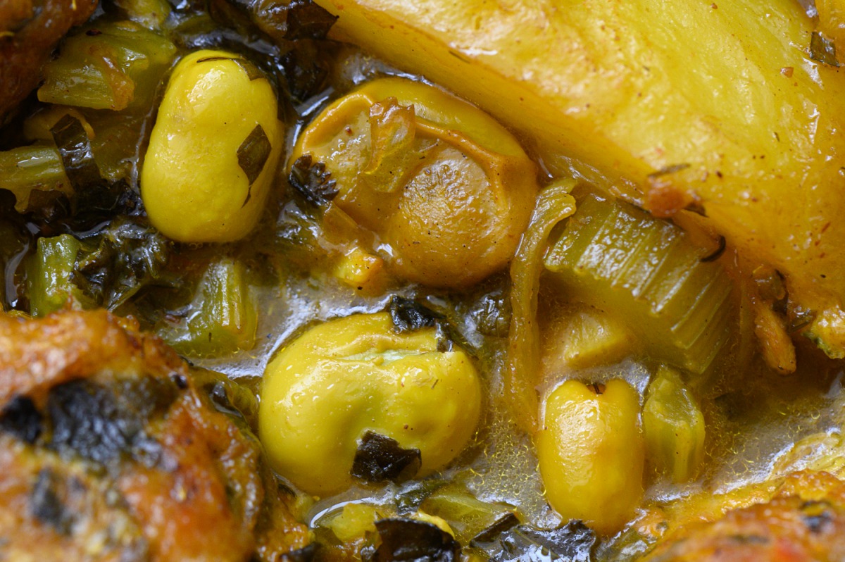 בסיר נירוסטה שטוח ורחב ניצוק רבע כוס שמן זית ונטגן קודם את הסלרי, הפול, 10 עלי גפן קצוצים דקיק והבצל נטגן כ-5 דקות, נוסיף את השום והעגבניה נערבב היטב, נוסיף את המים המתובלים, נביא לרתיחה, כשרותח, נכסה וננמיך לאש הקטנה (כ-10 דקות)