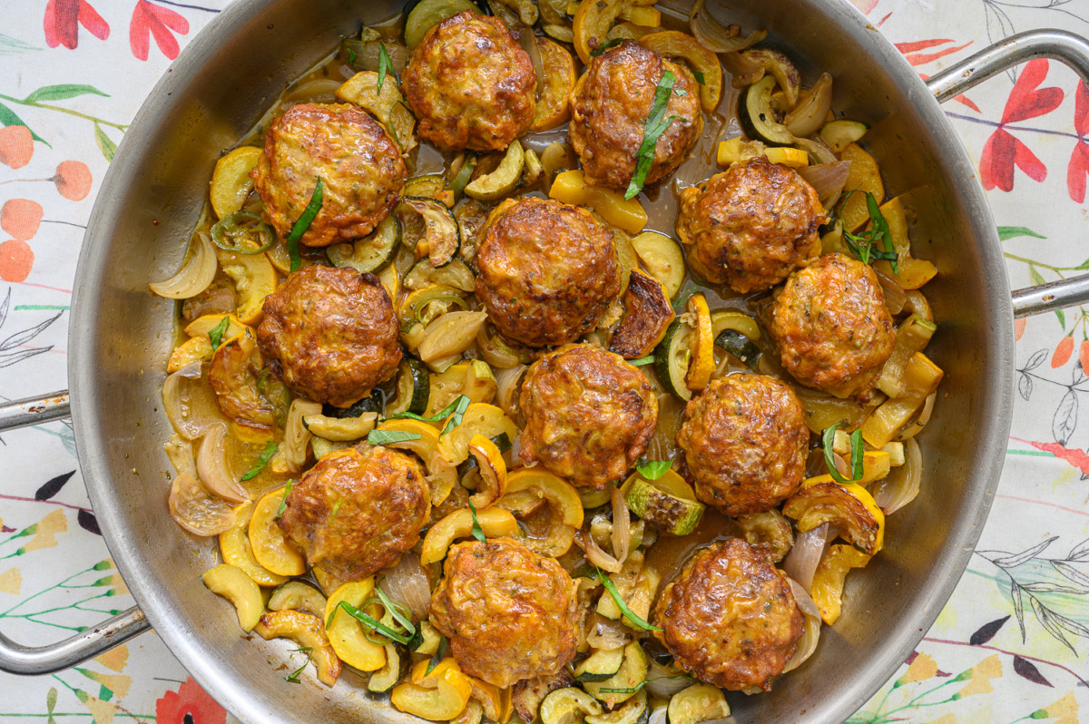 3. הסיר: ב3 כפות שמן זית נקפיץ את קשתות הקישואים והבצל עד הזהבה קלה, נוסיף כף פסטו, נערבב, נשבץ את הקציצות בינות הקישואים, ניצוק מים מתובלים, נשקש את הסיר, כשרותח, נכסה 20 דק’ אש קטנה.