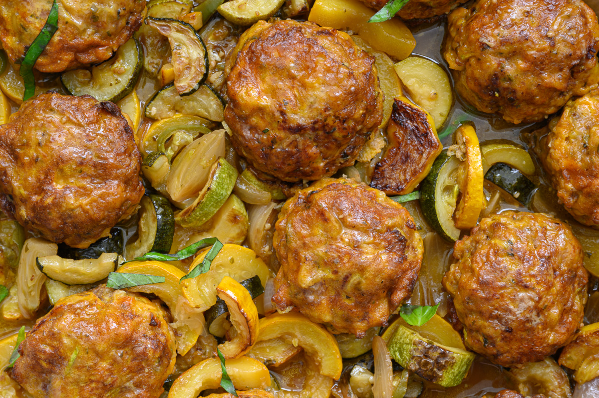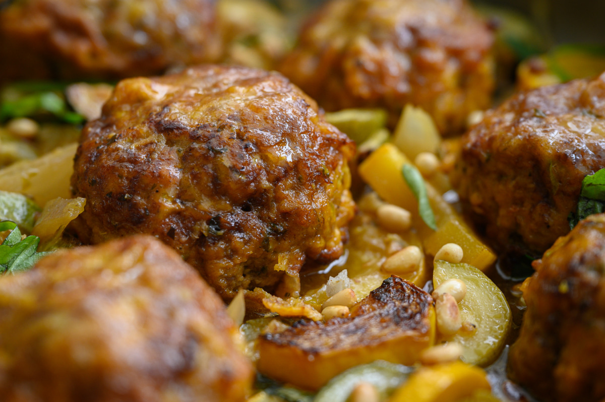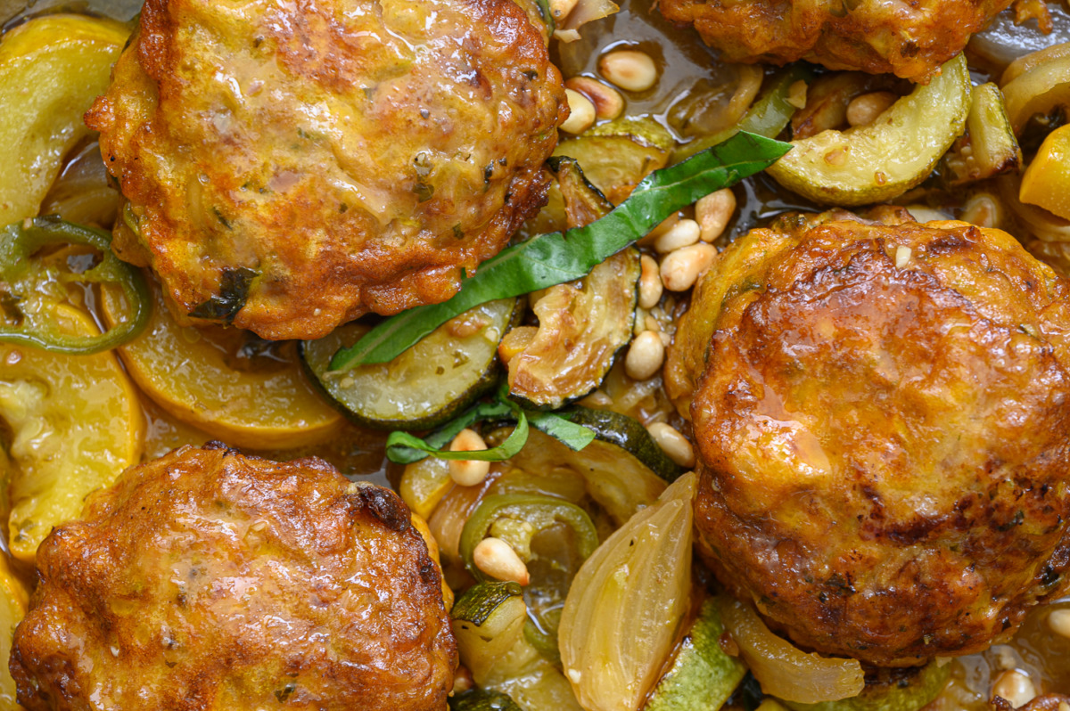 2. הקציצות: בקערה נלוש יחד: בשר טחון, זוקיני מגורד, כפית מלח, רבע כפית פלפל שחור, 2 כפות פסטו, צנוברים, 2 שיני שום כתושות, גרידת לימון, פירורי מצה, כף רסק עגבניות וביצה. ניצור קציצות יפות. נצפה הקציצות בקורנפלור ורק אח”כ בתערובת הביצה.