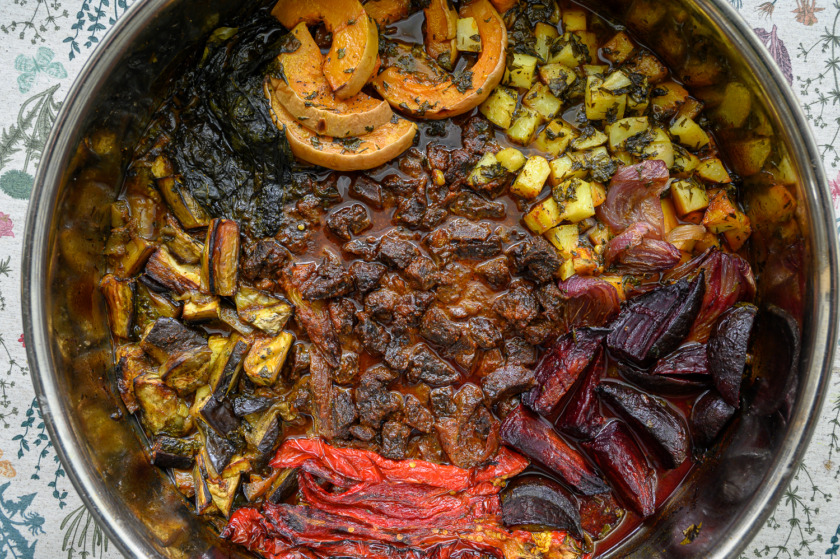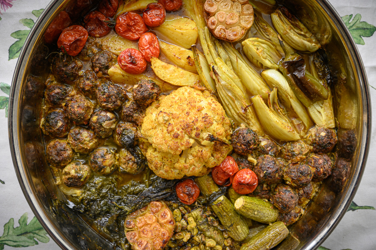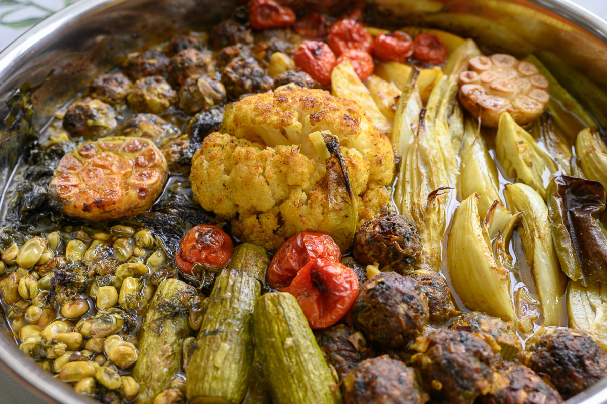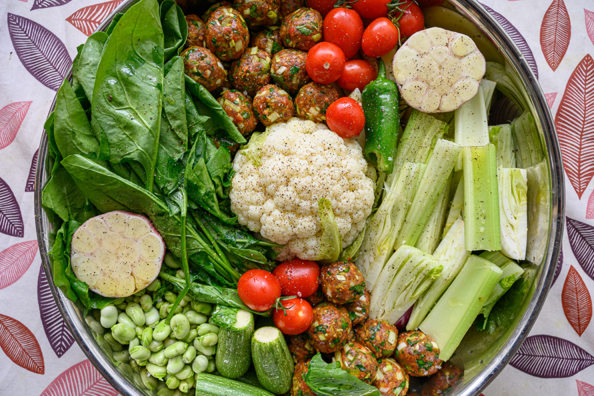נרכיב סיר: ניצוק כמה כפות שמן זית, נפזר את עלי הגפן והבצל הסגול. במרכז נעמיד את הכרובית המבושלת, נכתר אותה משני צידיה בקציצות, תפחי אדמה, שומר, קישואים, תרד, פול ואשכול שרי תמר, נניח את חצאי השום. ניצוק על כל היופי שלוק נדיב של שמן זית: על הכרובית, התפחי, השו הטרי וכולי, עוד קצת מלח גס על הכרובית והתפחי. פלפל שחור טרי.