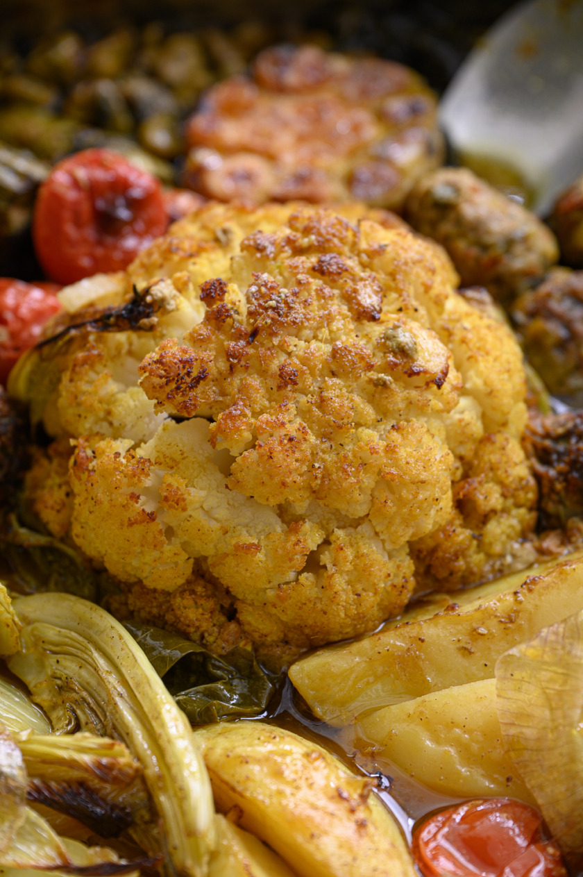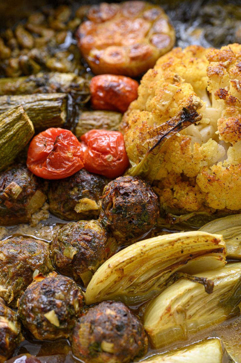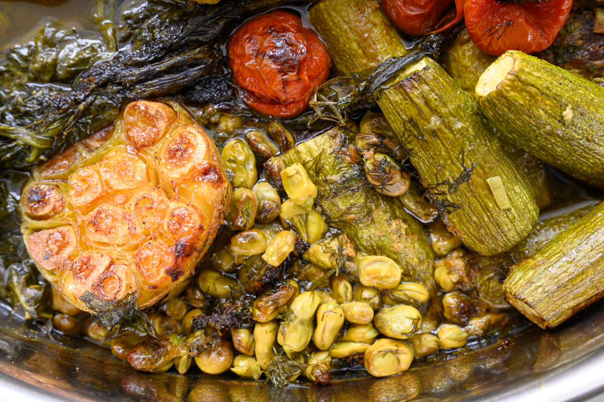 נרכיב סיר: ניצוק כמה כפות שמן זית, נפזר את עלי הגפן והבצל הסגול. במרכז נעמיד את הכרובית המבושלת, נכתר אותה משני צידיה בקציצות, תפחי אדמה, שומר, קישואים, תרד, פול ואשכול שרי תמר, נניח את חצאי השום. ניצוק על כל היופי שלוק נדיב של שמן זית: על הכרובית, התפחי, השו הטרי וכולי, עוד קצת מלח גס על הכרובית והתפחי. פלפל שחור טרי.