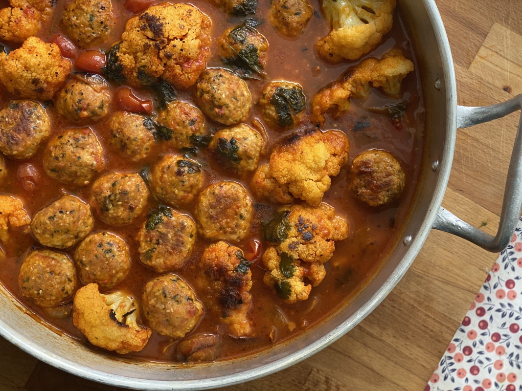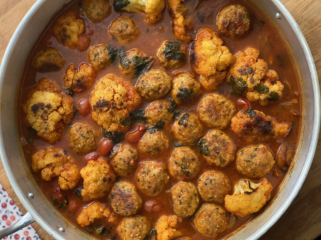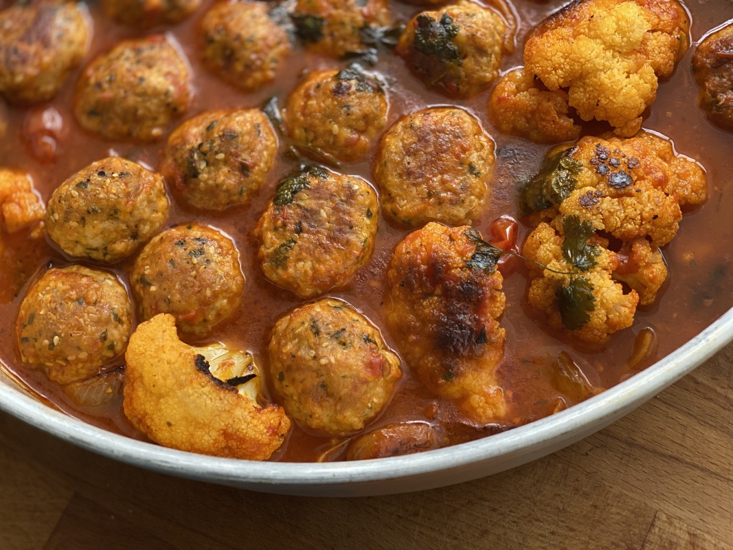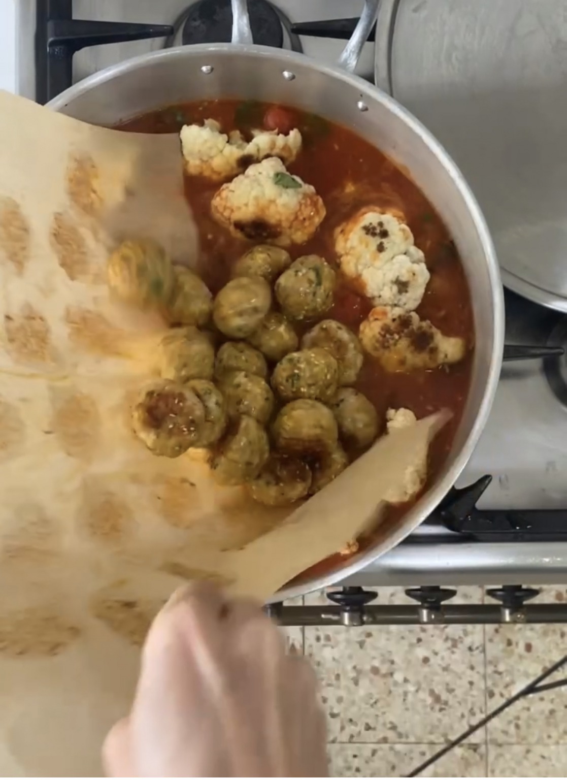 3. עם הדף אפייה נגליץ’ את הקציצות שלנו לסיר, נשקשק מעט. נעטר בעלי כוסברה (או כל עלה אהוב), כשרותח ננמיך סיר אש קטנה כ-40 דקות