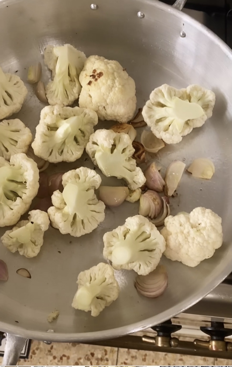 2. בינתיים בסיר שטוח ורחב וברבע כוס שמן זית נטגן את הבצל ופרחי הכרובית, כשטיפהל’ה משחים, נוסיף את הרוטב, נשקשק מעט את הסיר, נטעם ונתקן תיבול