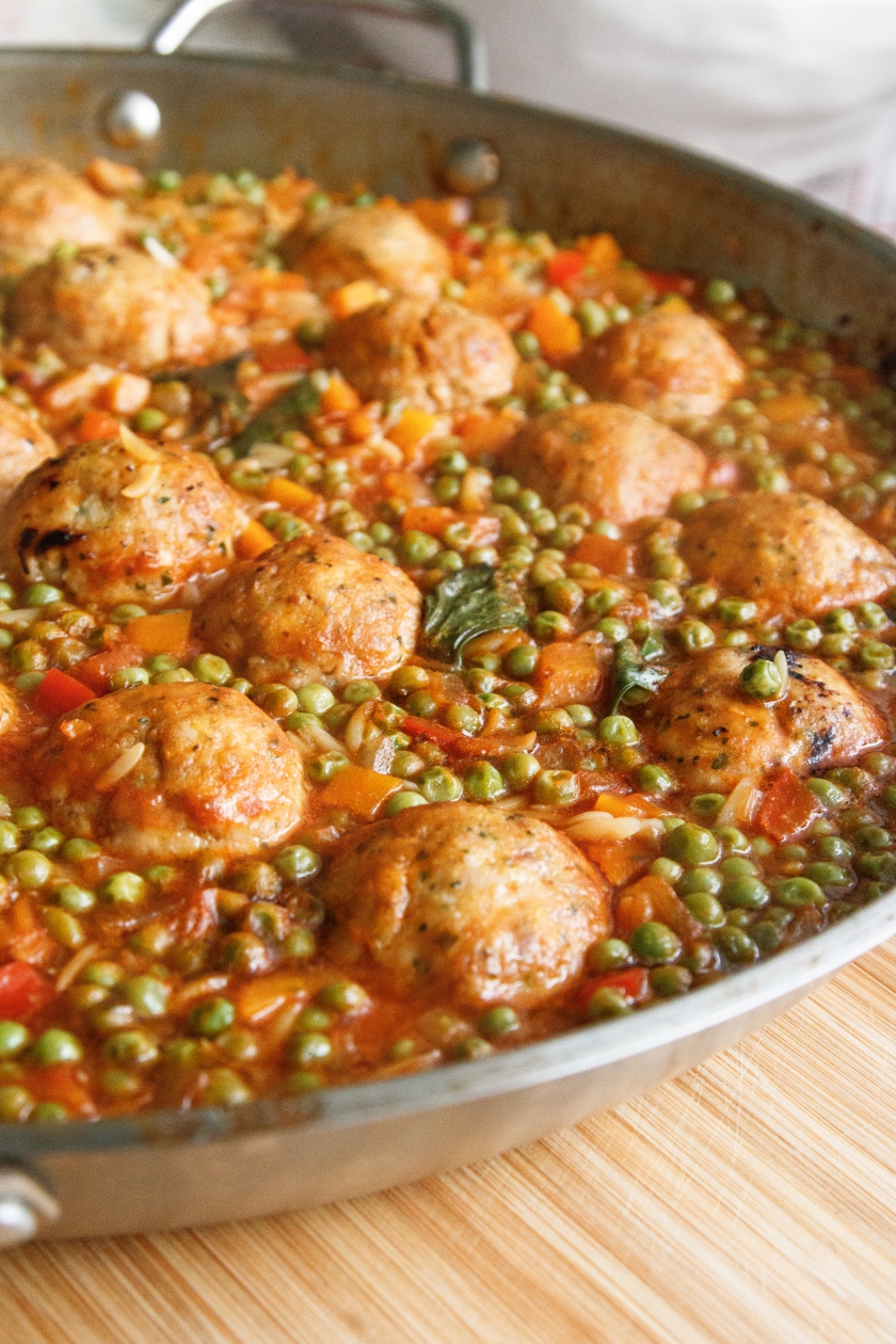 - עכשיו זה שלב חשוב, המים צריכים להיות בערך בגובה הקציצות, אם זה יותר נמוך נוסיף מים ונתקן תיבול בהתאם, נביא לרתיחה ואז נוסיף כוס פתיתים או אורז או בורגול לא מוכן וכוס אפונה. נבשל 15 דקות או עד לרכות.