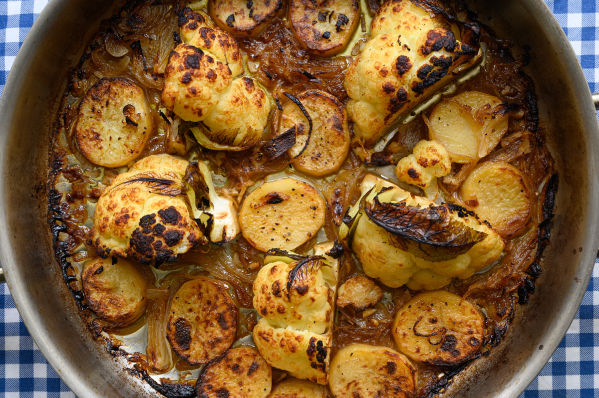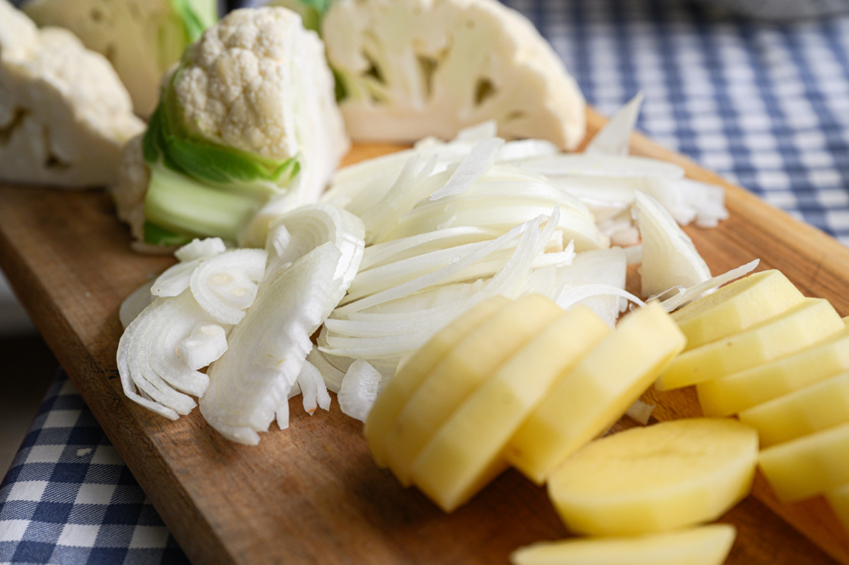 1. בסיר שטוח המקבל תנור על להבהגבוהה נצרוב במעט שמן זית את פרחי הכרובית, אחרי כ-2 דקות נוסיף את טבעות הבצל והתפוחי אדמה שלנו, נזהיב גם אותם קלות.