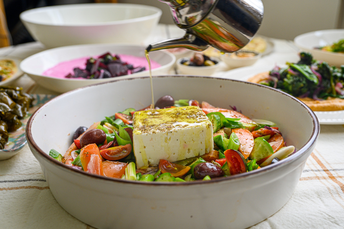 תראו להכין סלט יווני זה קל, המכשול היחיד ועליו חייבים להקפיד שכל הירקות חייבים להיות טריים ופריכים. רק בהגשה נערבב הסלט.