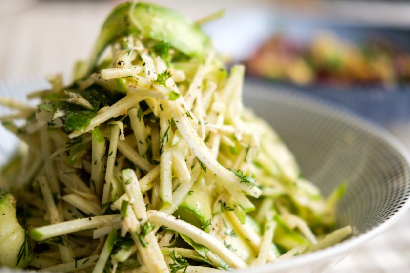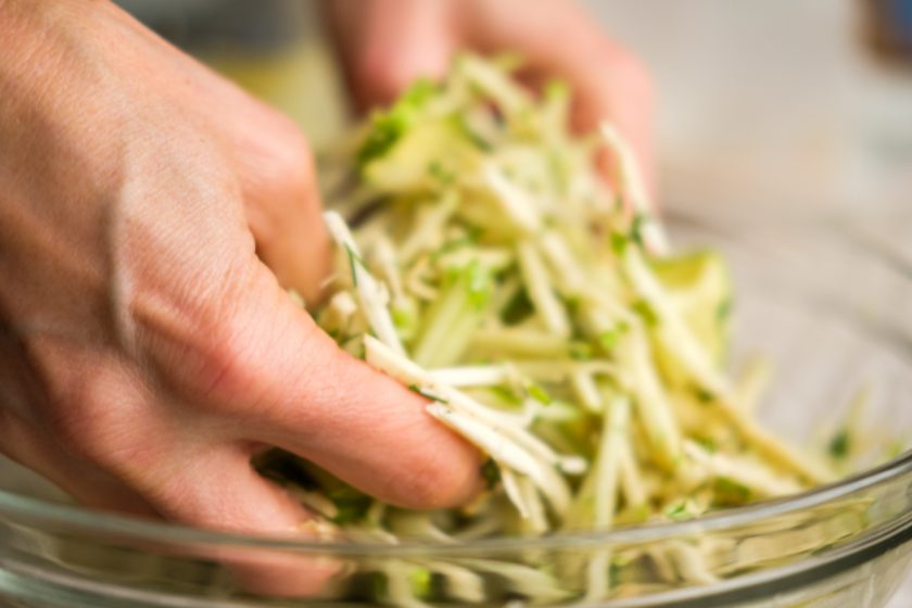 1. נערבב את כל מקלות הירק:סלרי,תפוח עץ קולורבי, חזרת מגוררת עם הקישוא ועשבי התיבול