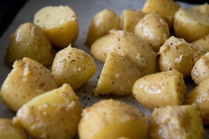 3. נחתוך איך שבא, נערבב את התפחי אדמה המצוננים ברבע כוס שמן זית, 3 שיני שום כתושות, כפית מלח ופלפל