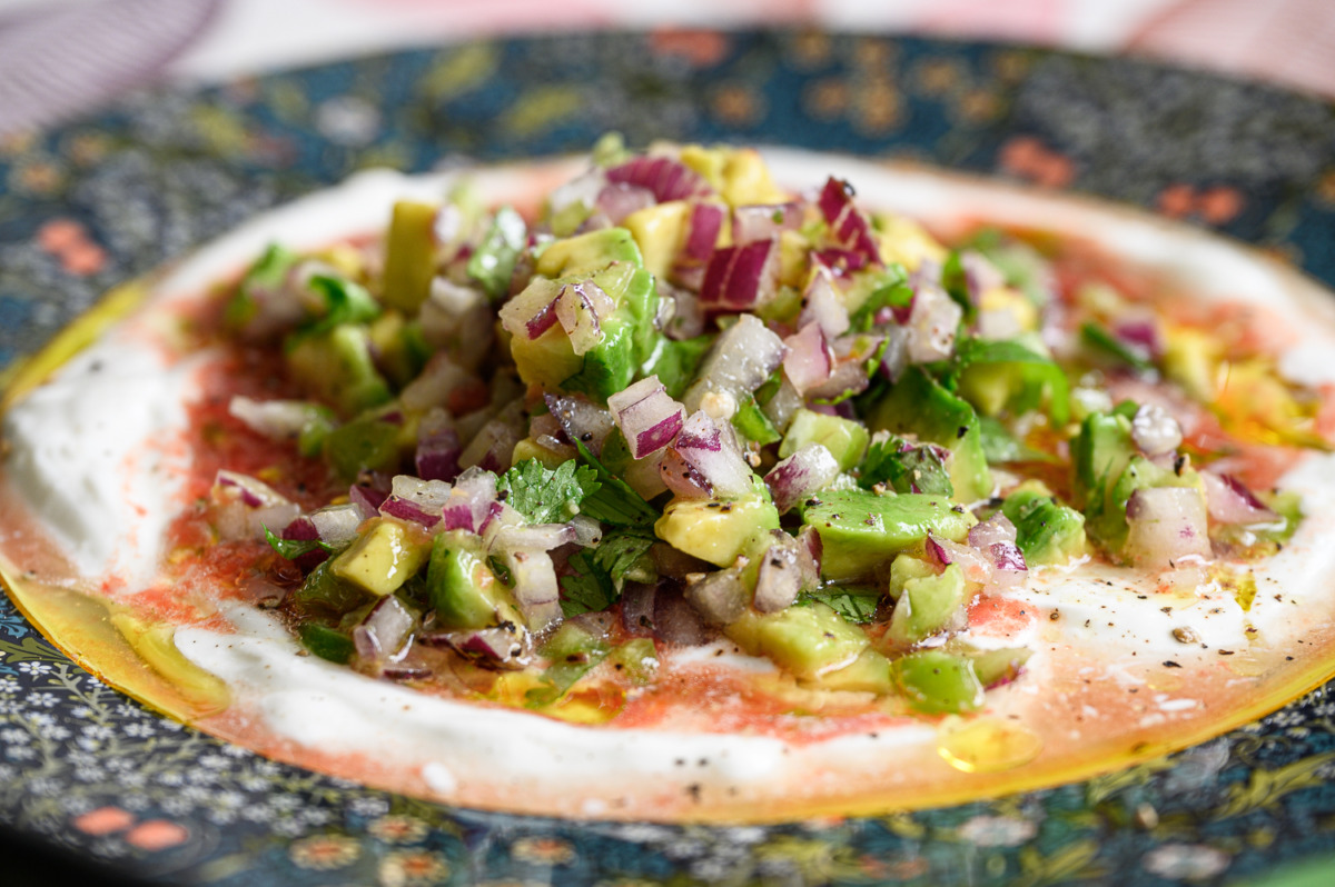 הרכבה: על צלחת הגשה יפה נמרח את הגבינה/לבנה/יוגורט שלנו, מעל עגבניות שגירדנו בפומפיה ואז הסלט הקצוץ ועל כל היופי הזה נזליף עוד מעט שמן זית ופלפל שחור טחון טרי. נגיש מיד.