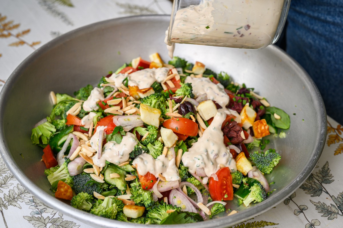 1. מכניסים את כל יפי הירקות לקערה, מפזרים שקדים קלויים וקוביות או פירורי גבינה, יוצקים את הרוטב רק לפני הגשה. טורפים.