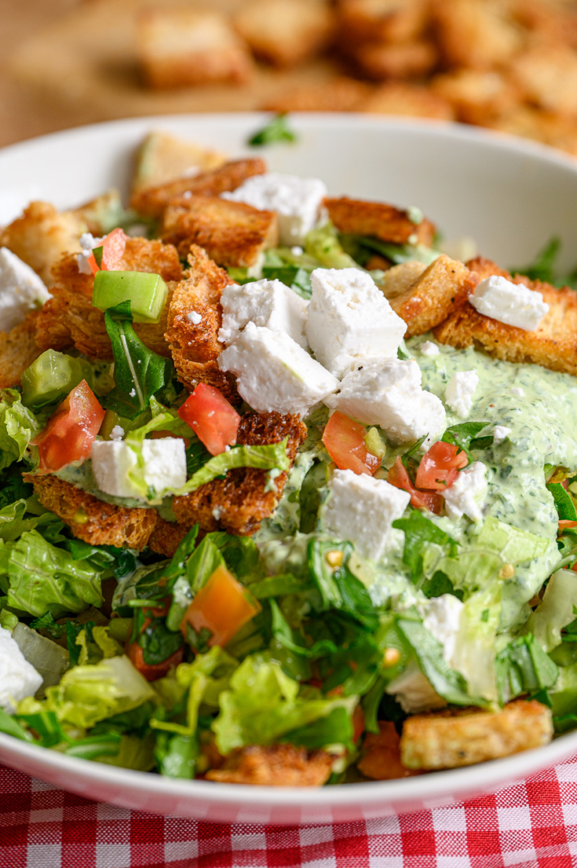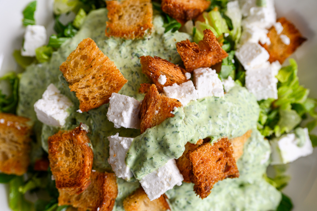 הרכבה: נערבב: רוקט, חסה, מלפפונים, עגבניות ועשבי תיבול ורק לפני ההגשה נחבר עם הרוטב, הקרוטונים והצפתית.