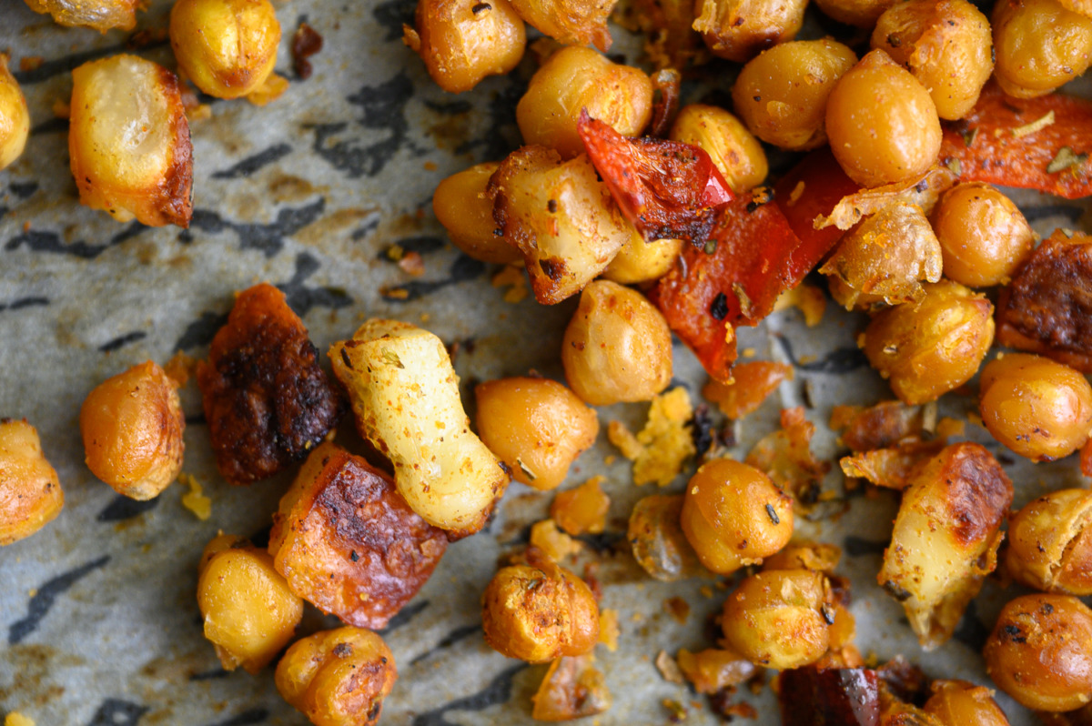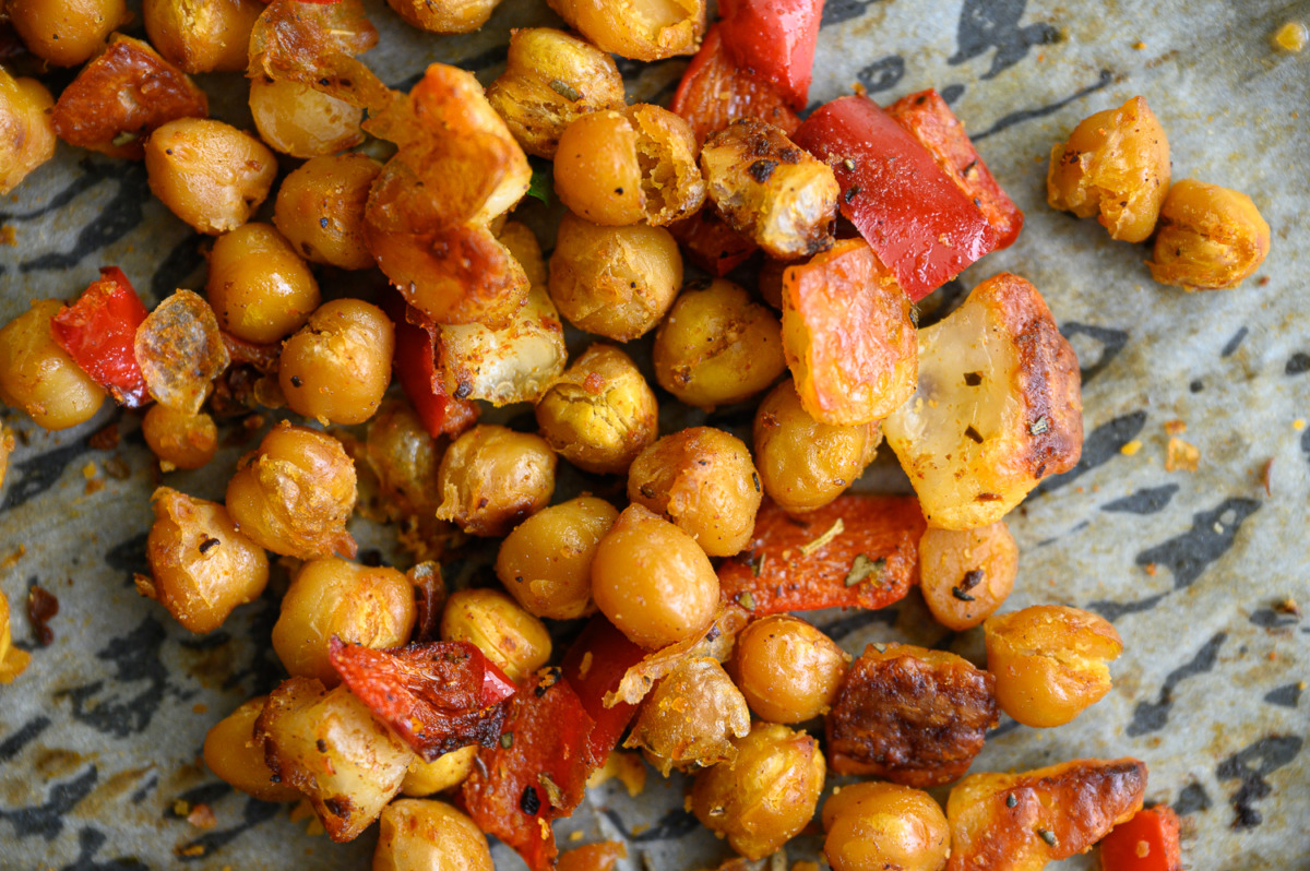 החומוסים: נייבש טוב טוב את החומוסים על מגבת (חשוב לייבש) ונכניס אותם לקערה נוסיף: גבינת חלומי קוביות, פלפל אדום קוביות, שמן זית ותבלינים נערבב נשטח על דף אפייה שיהיו כולם בשכבה אחת. נכניס לתנור 30 דקות אחרי רבע שעה נערבב קלות. נוציא ונצנן לחלוטין