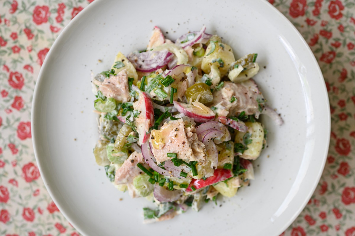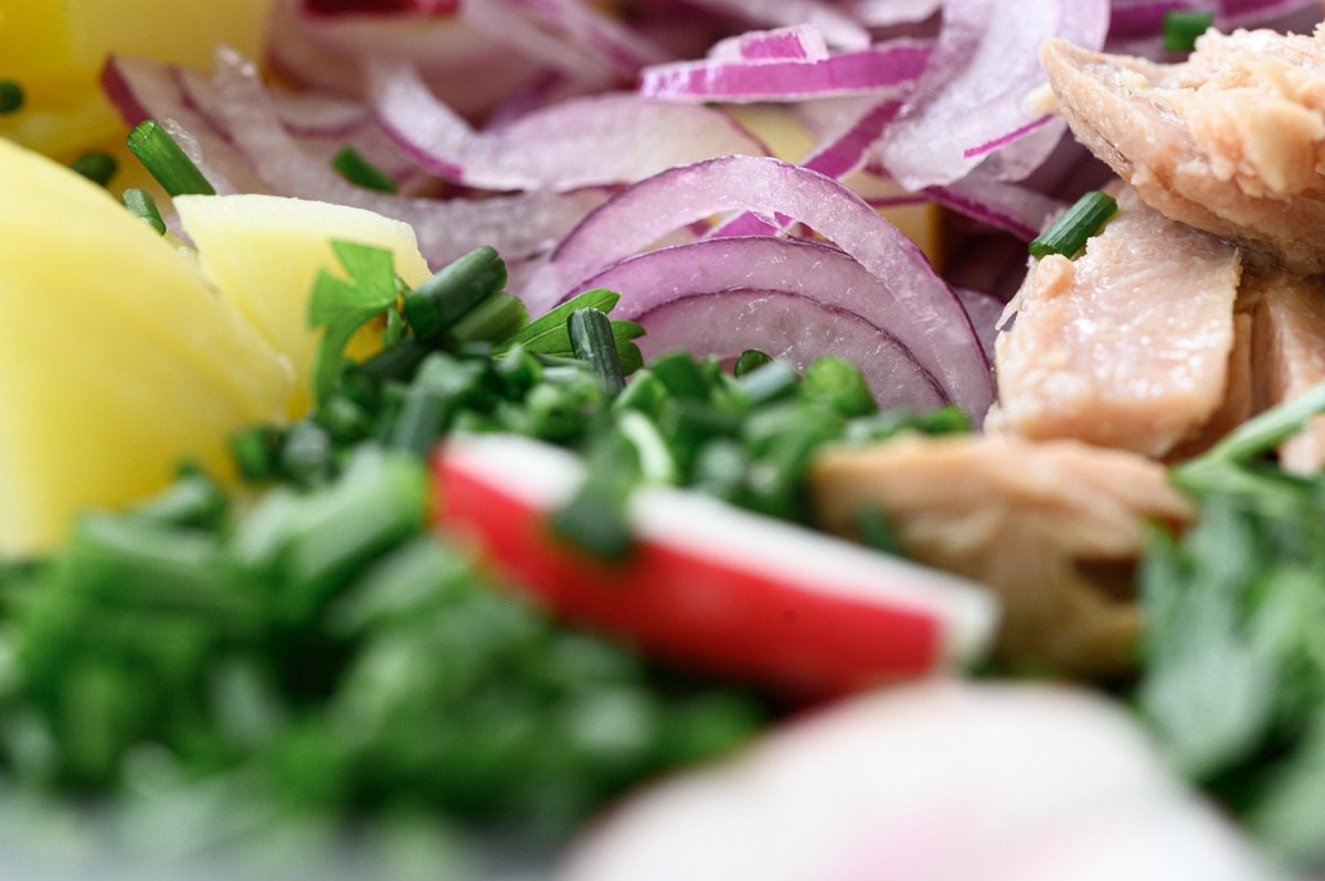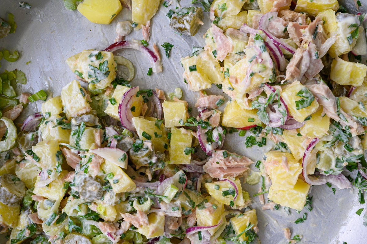2. נחתוך את התפחי קוביות, נוסיף טונה מסוננת, מלפפונים חמוצים, צנוניות,סלרי ובצל סגול, נוסיף עשבי תיבול ועירית