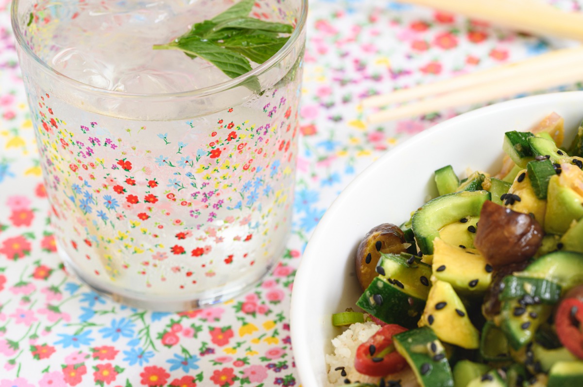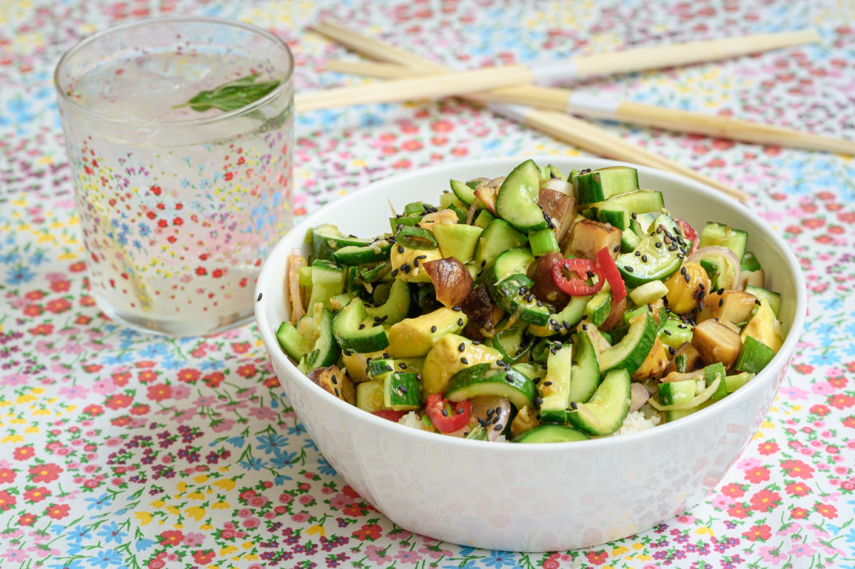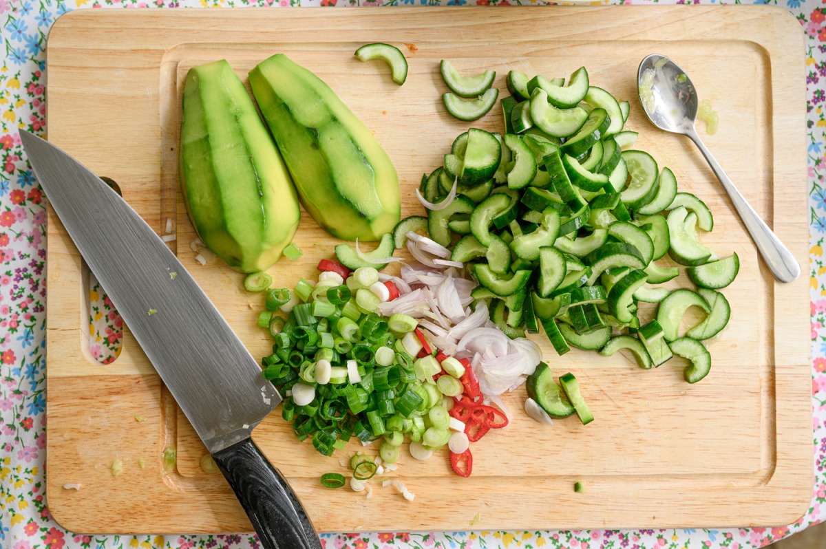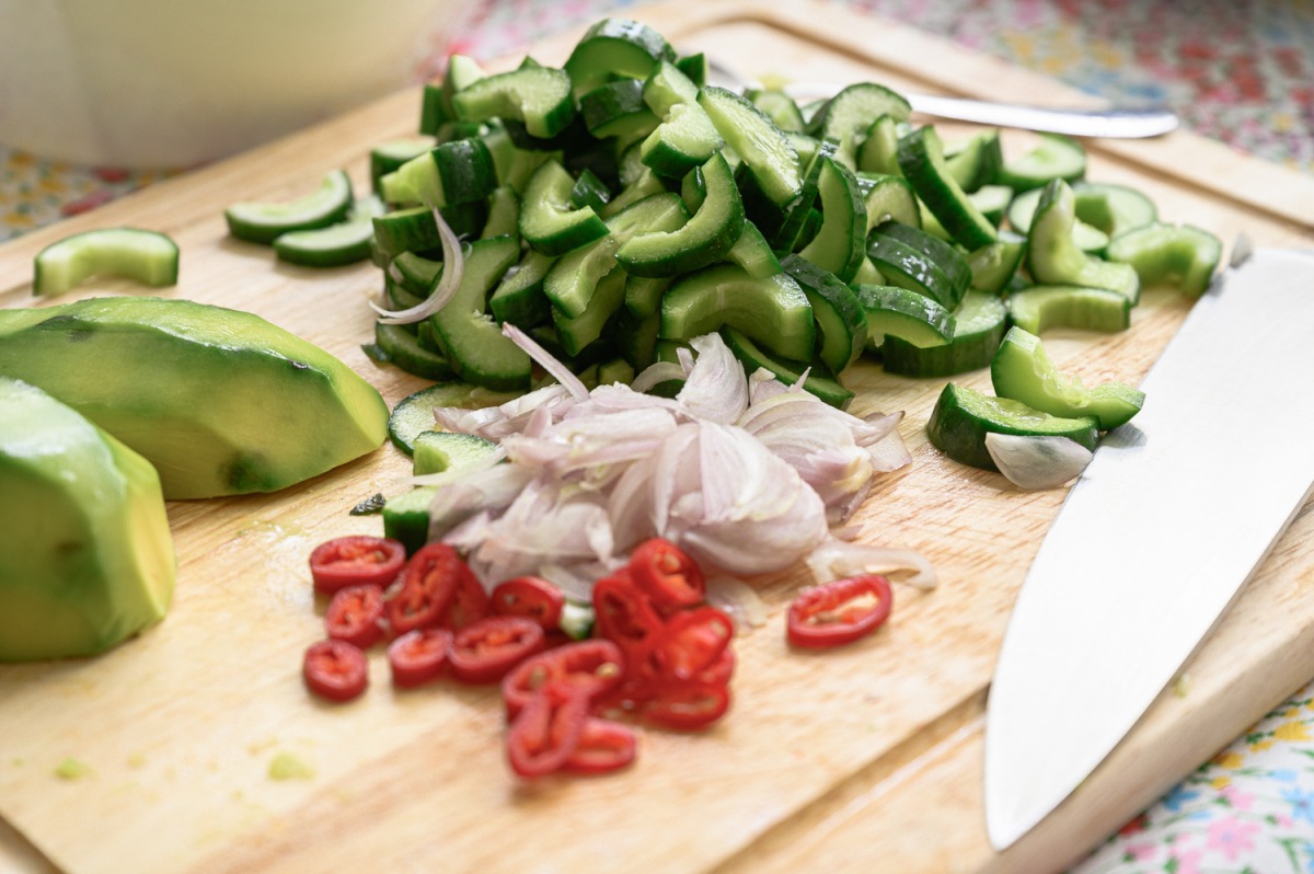 1. נחצה מלפפונים ננקה מליבת הזרעים עם כפית ונחתוך לסהרונים, נחתוך אבוקדו לקוביות, צ’ילי לטבעות, בצל סגול לפרוסות דקיקות, נוסיף ערמונים קצוצים, נענע, כוסברה ובצל ירוק