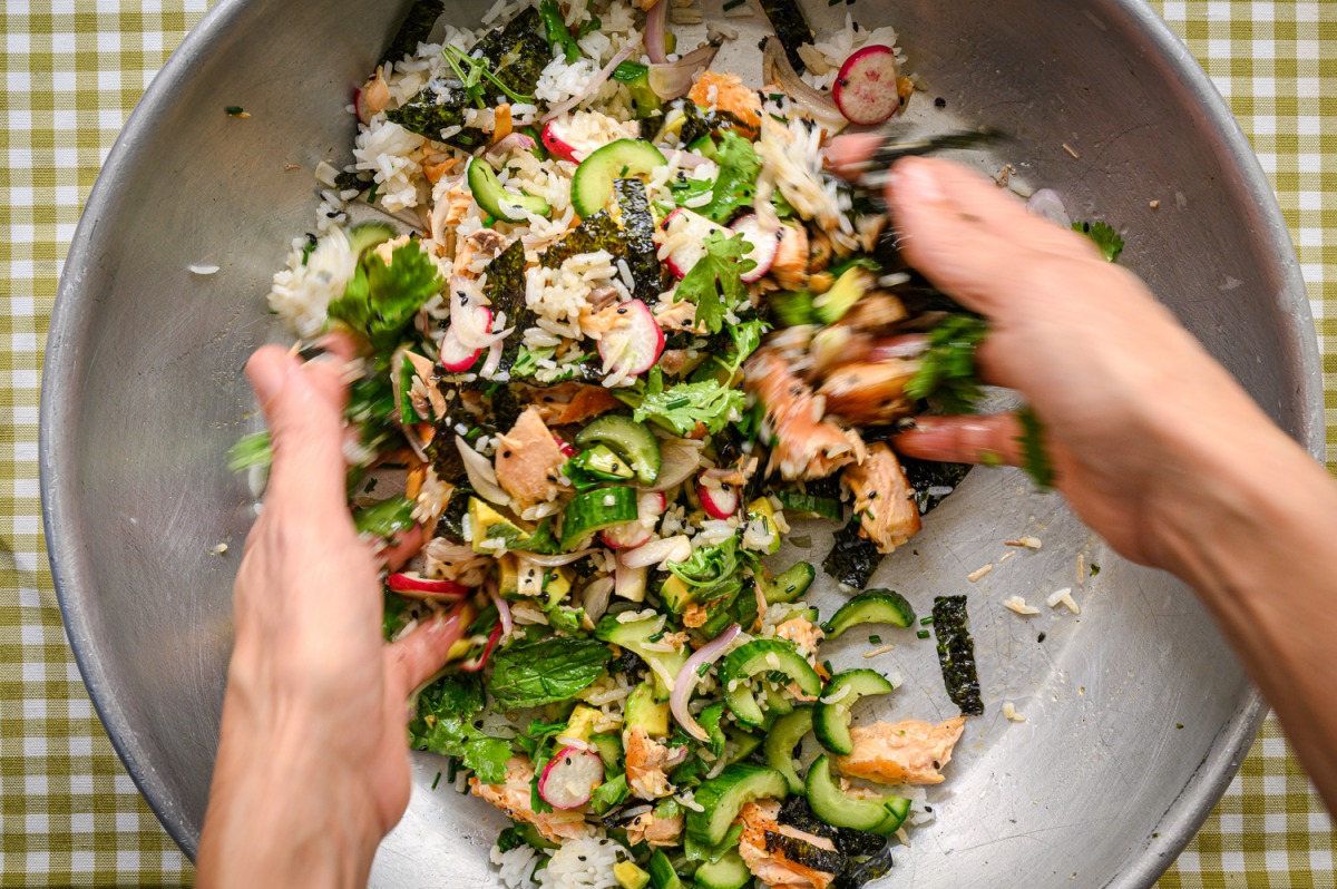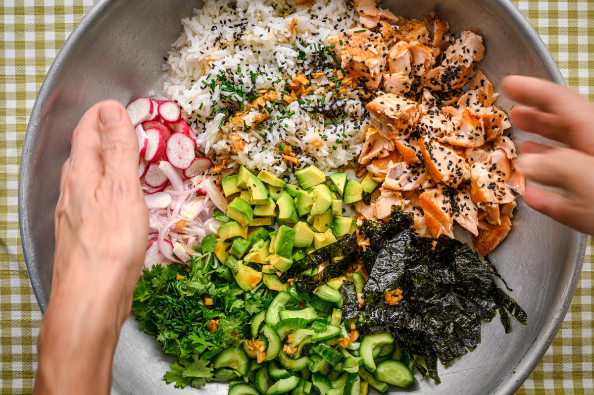 2. הסלט: נסדר יפה יפה את כל מרכיבי הסלט: סלמון מפורק, אורז, אבוקדו, מלפפונים פריכים, צנוניות, אצות, כוסברה ועירית ומי שאוהב גם בצל סגול ניצוק את הרוטב נערבב קלות, נוסיף מעט חטיף אצות שבורות ושומשום שחור. נטרוף