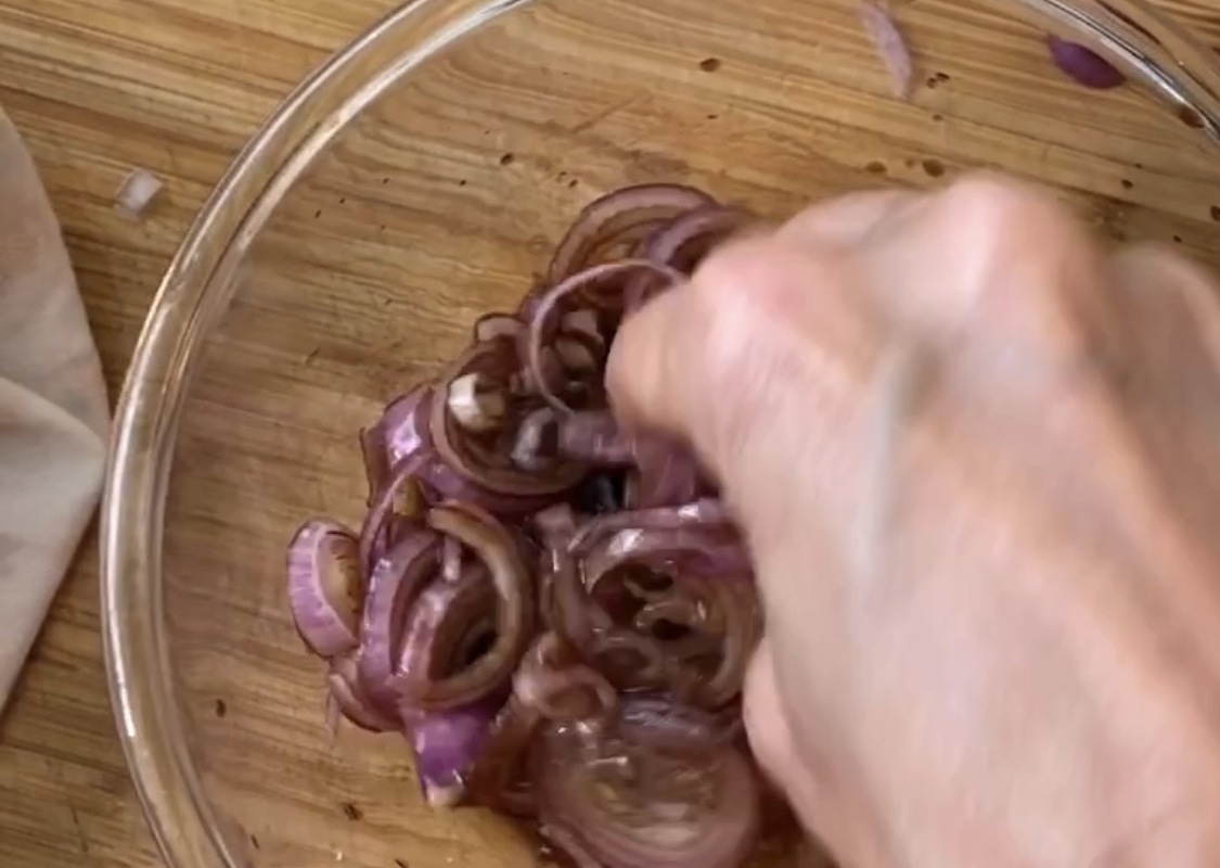 3. הבצל הכבוש: – נפרוס את הבצלים לטבעות דקיקות (ממש חשוב), נכניס לקערה קטנה, נוסיף 3 כפות בלסמי, 4 כפות שמן זית,דבש או סילאן, כפית שטוחה מלח ורבע כפית פלפל, נמולל מעט את הבצל הפרוס בחומרי המשרה, נניח בצד לכבישה מהירה כרבע שעה