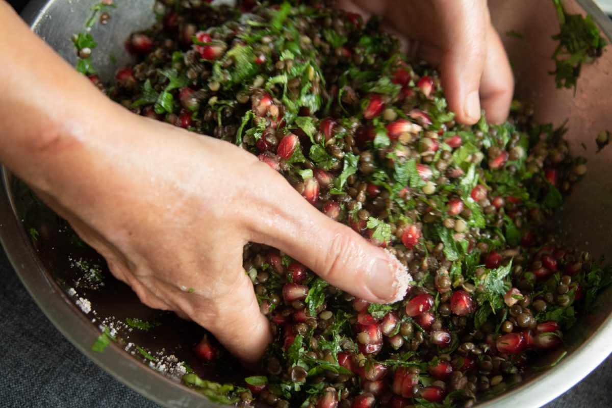4. רק לפני הגשה נחבר את הסלט: רימונים, עדשים, עשבי תיבול, מלח, שמן זית. כל כך טעים