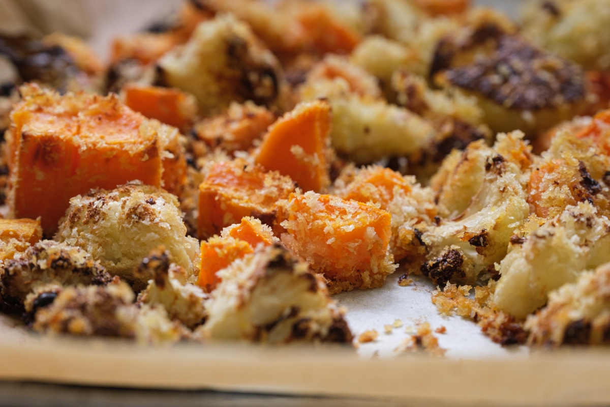 2. נכניס לקערה גדולה את פרחי הכרובית, הבטטה,פאנקו, מלח ושמן זית נערבב היטב, נשטח על תבנית עם דף אפייה, נאפה 180 מעלות כ-חצי שעה עד הזהבה יפה. איזה טעים זה אין דברים כאלה