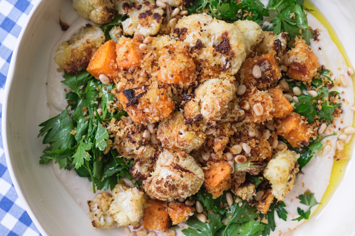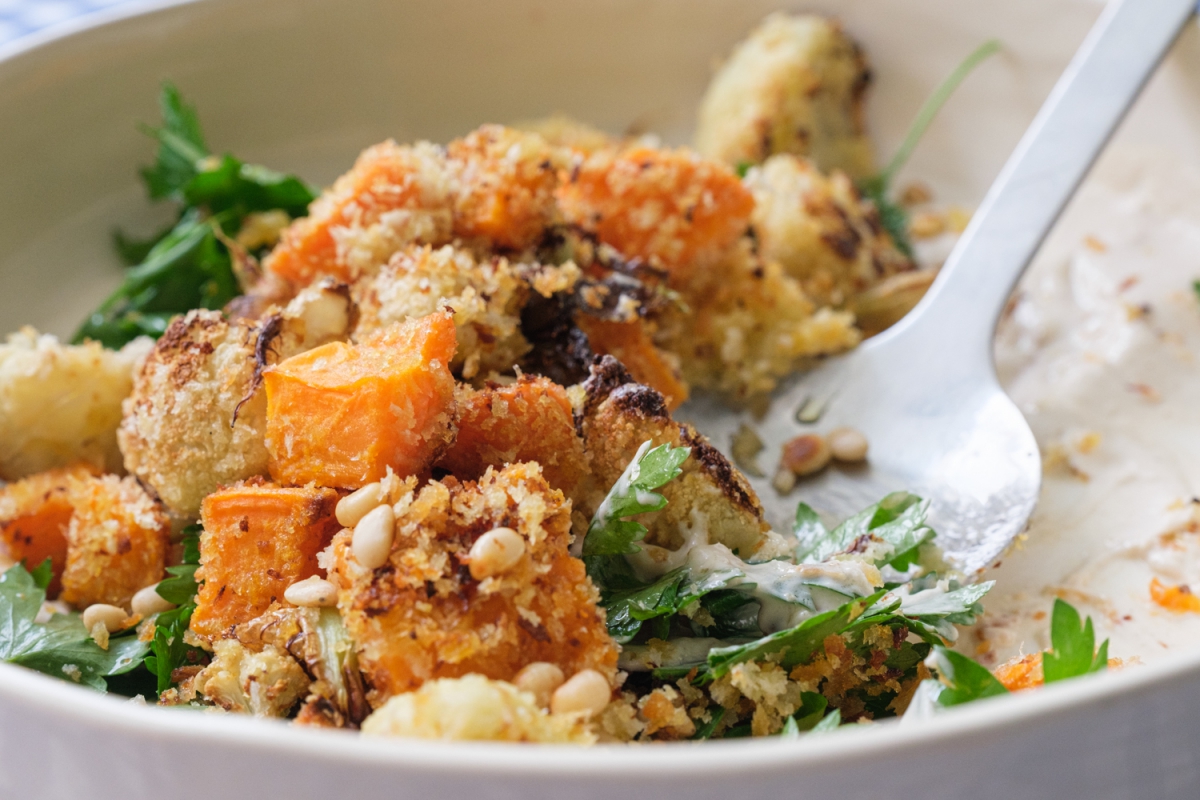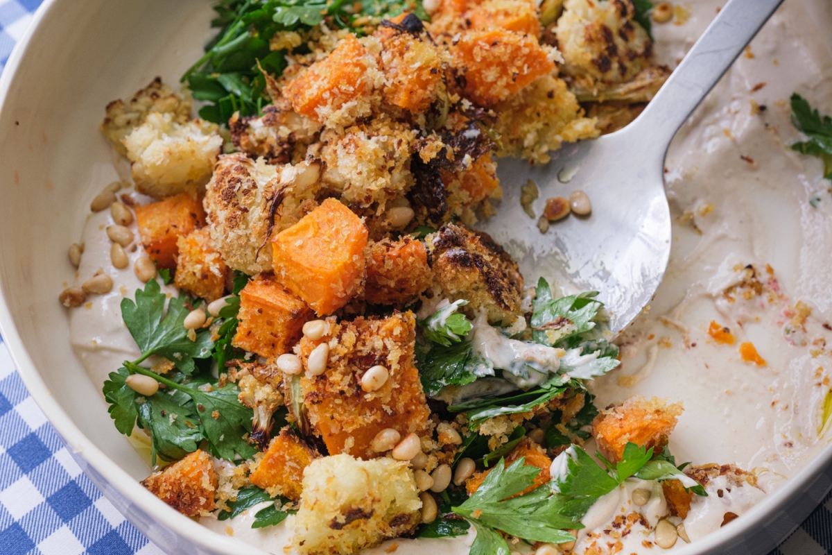 5. ההגשה: בצלחת הגשה יפה נבנה את הסלט: טחינה יוגורט מעליה פריכות הסלט הירוק וממעל הכרובית והבטטה עם קונפטי הפאנקו, נעטר בצנובר קלוי, נזליף מעט שמן זית ושפריץ לימון.