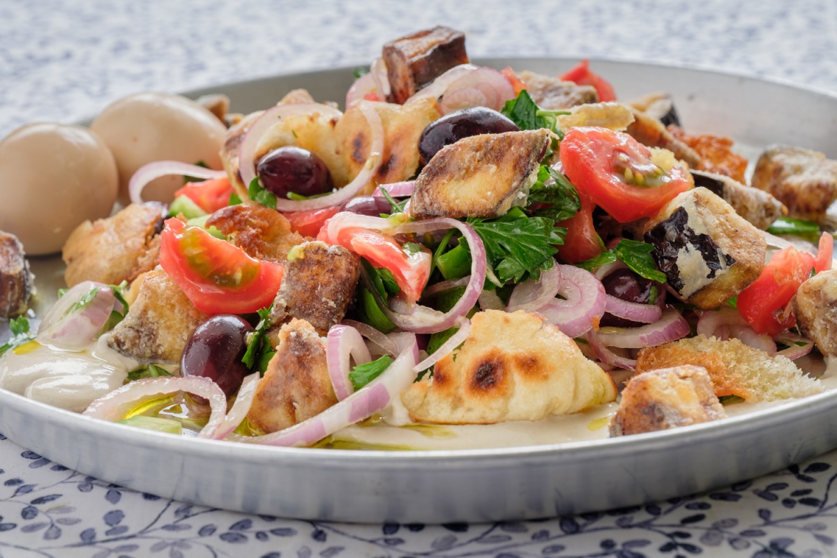 7. להגשה: בצלחת הגשה יפה ניצוק תלולית טחינה, נסדר יפה ממעל את הסלט, ננקד בקרעים של לחם קלוי ובקוביות חציל. נפזר ביצים קשות נתענג.