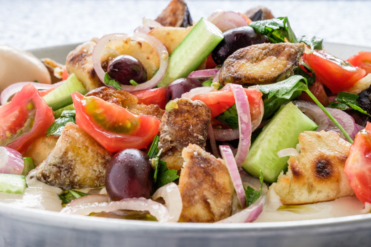 7. להגשה: בצלחת הגשה יפה ניצוק תלולית טחינה, נסדר יפה ממעל את הסלט, ננקד בקרעים של לחם קלוי ובקוביות חציל. נפזר ביצים קשות נתענג.