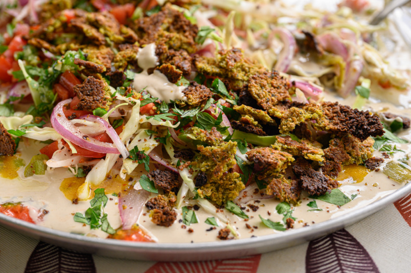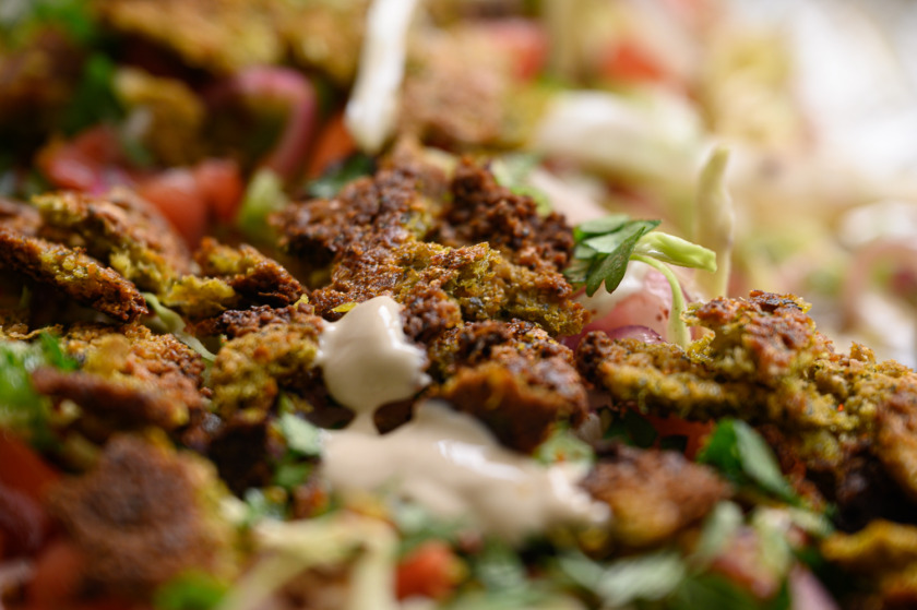 הרכבה: נשטח טחינה מדוללת על צלחת השה, נניח את הסלט, ננקד בטיפות עמבה ועשבי תיבול, נפורר מעל את קראמבל הפלאפל. נטרוף. ככ טעים.