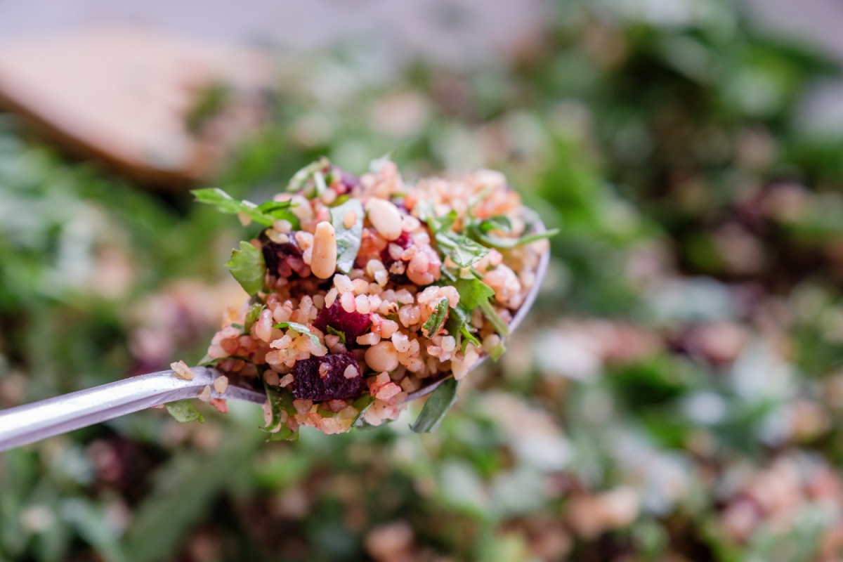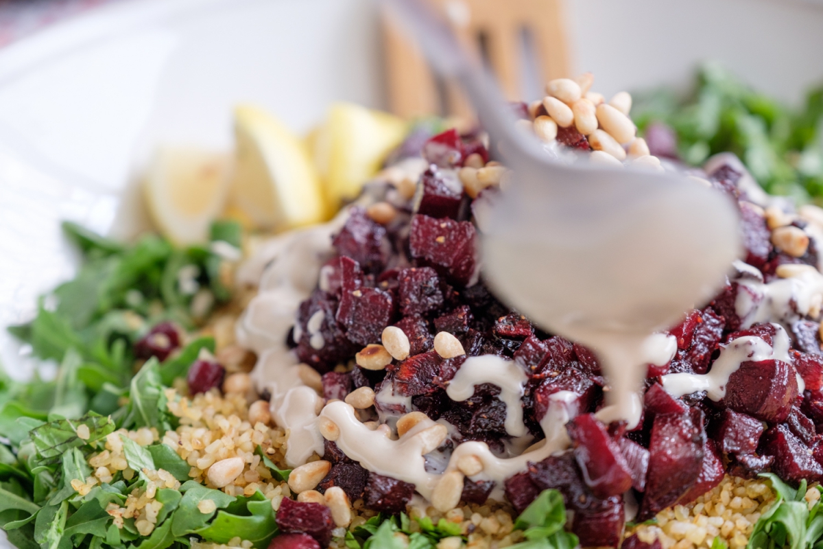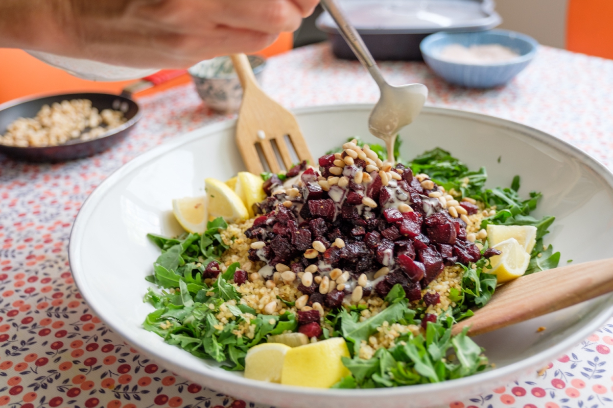 8. נרכיב את הסלט: הירוקים, הבורגול הקלוי, סוכריות הסלק המבריקות, וניצוק מעל טחינה, צנוברים וזץ לימון. כל כך טעים!