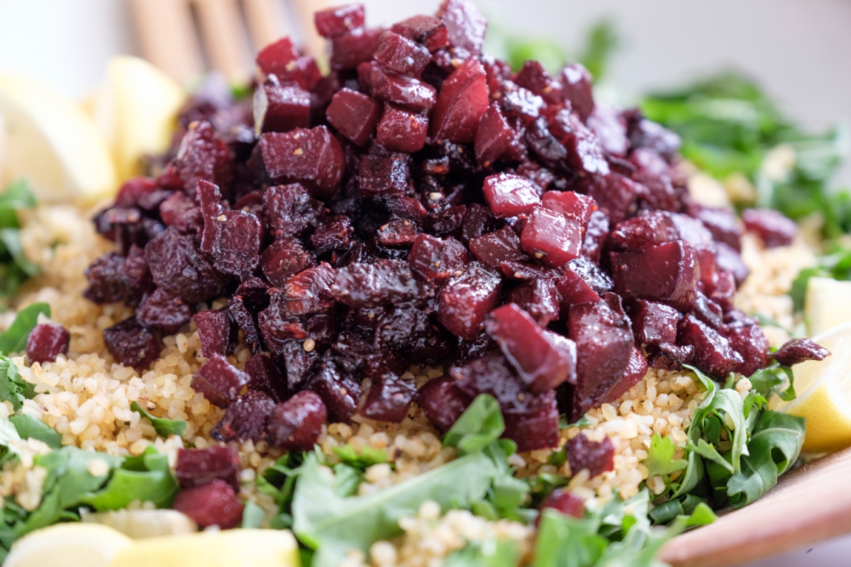 8. נרכיב את הסלט: הירוקים, הבורגול הקלוי, סוכריות הסלק המבריקות, וניצוק מעל טחינה, צנוברים וזץ לימון. כל כך טעים!