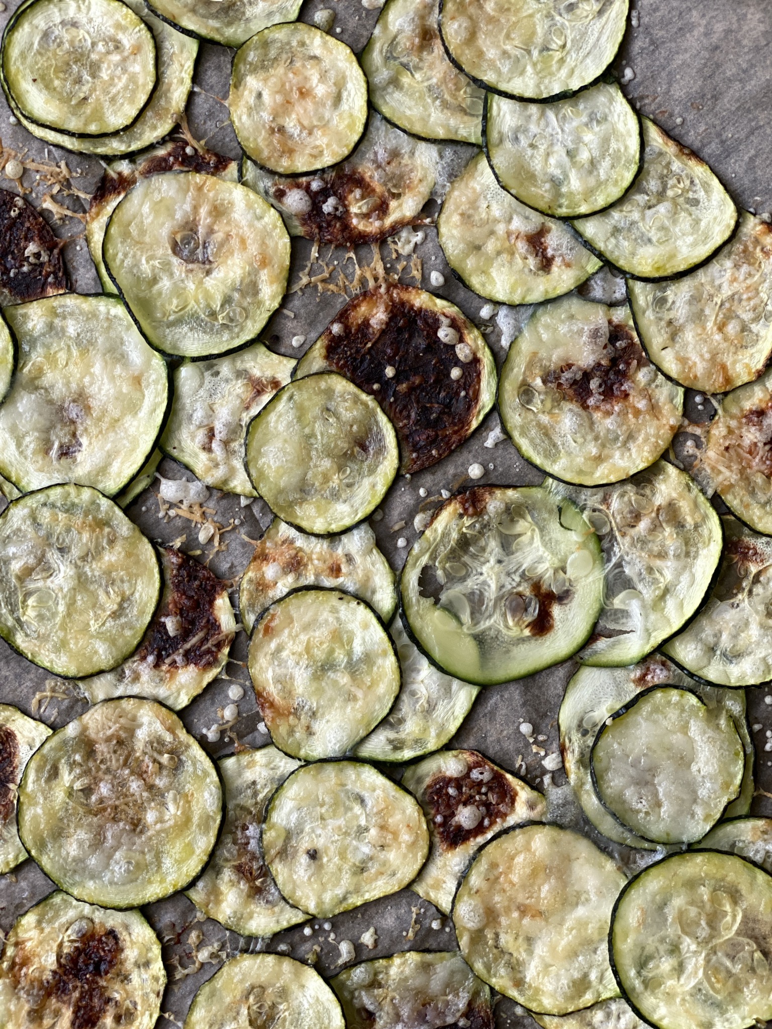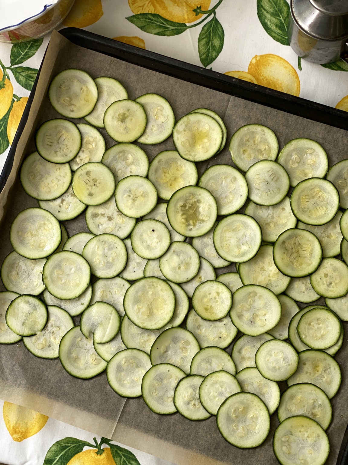 2. נדליק גריל 200 מעלות, על תבנית תנור עם דף אפייה משומן נניח את פרוסות הקישוא הדקיקות, נפדר בפרמזן ומעט שמן זית ונשגר לתנור לכ-רבע שעה. נוציא ונקרר