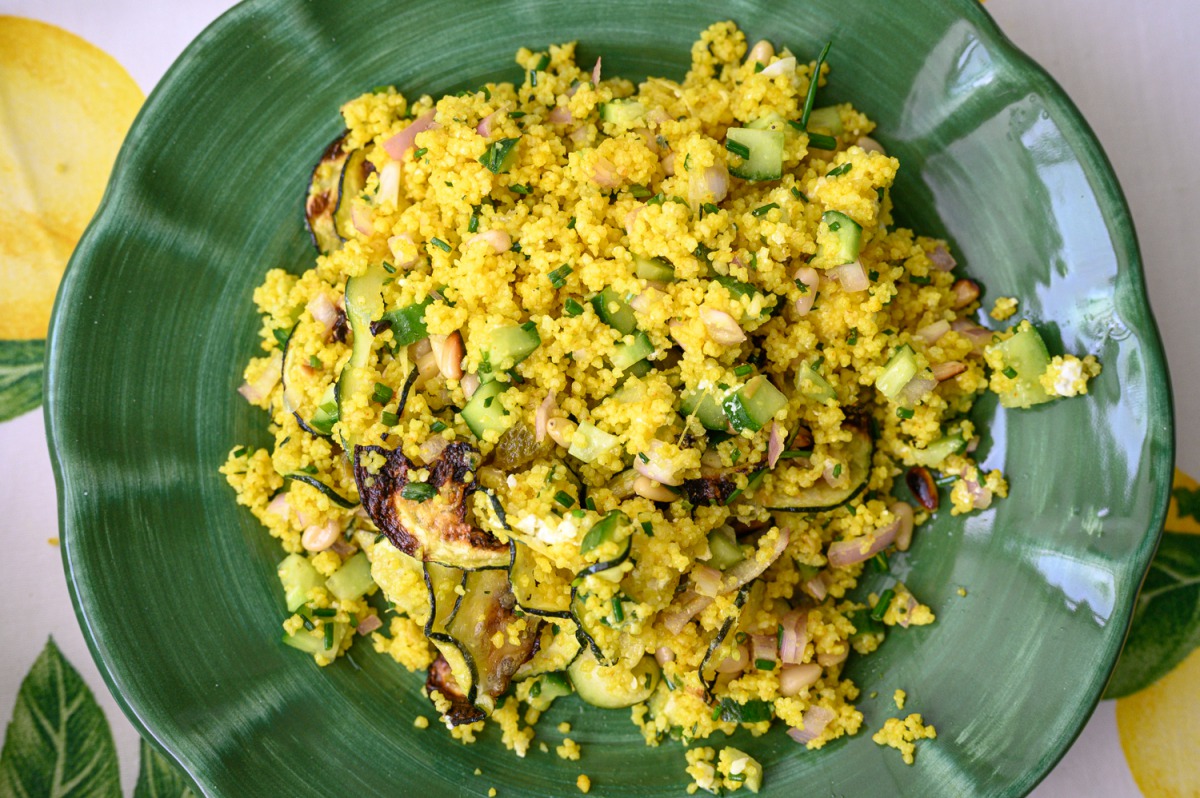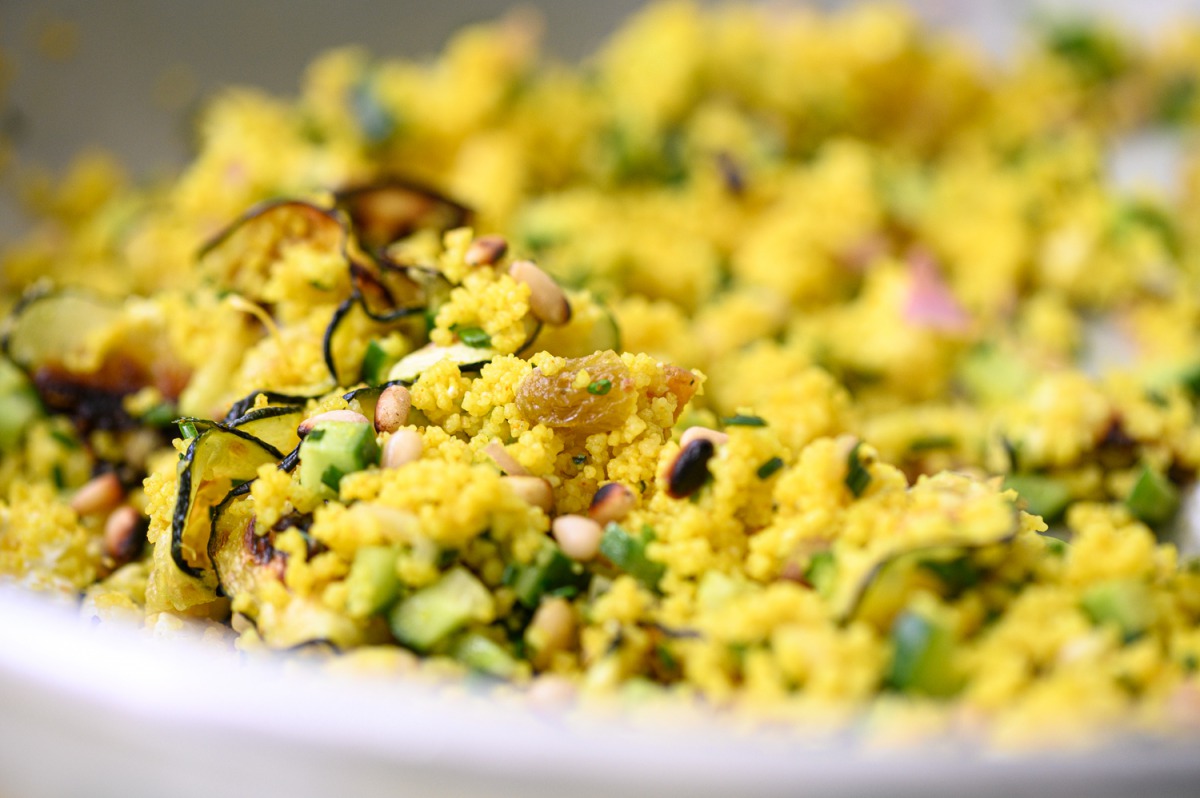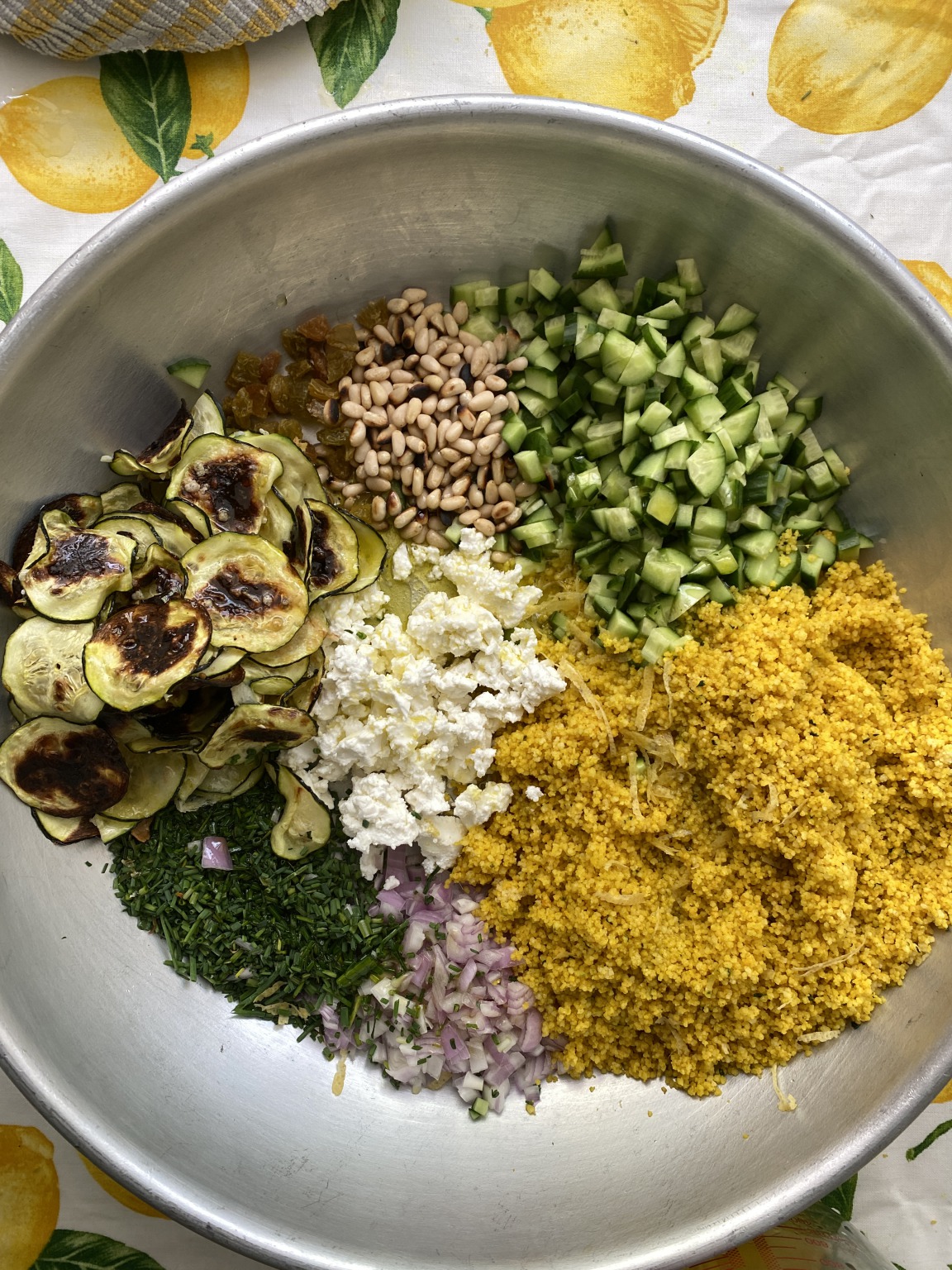 3. הרכבה: נסדר: בצל סגול חתוך דקיק, עירית, קוסקוס ריחני, דקיקי קישוא, צנובר, צימוקים, מלפפונים, פירורי גבינה מלוחה ניצוק את הרוטב רק סמוך להגשה. נטרוף.