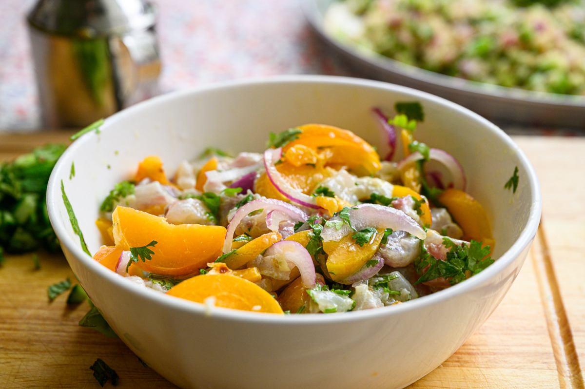 הסביצ’ה: נחתוך דג לבן טרי קוביות 2 סמ, נוסיף לדג: מיץ מלימון שלם, שמן זית, מלח גס, מישמשים, בצל סגול, עלי נענע, ג’ינג’ר מגורר ופלפל ירוק חריף. נערבב להגשה
